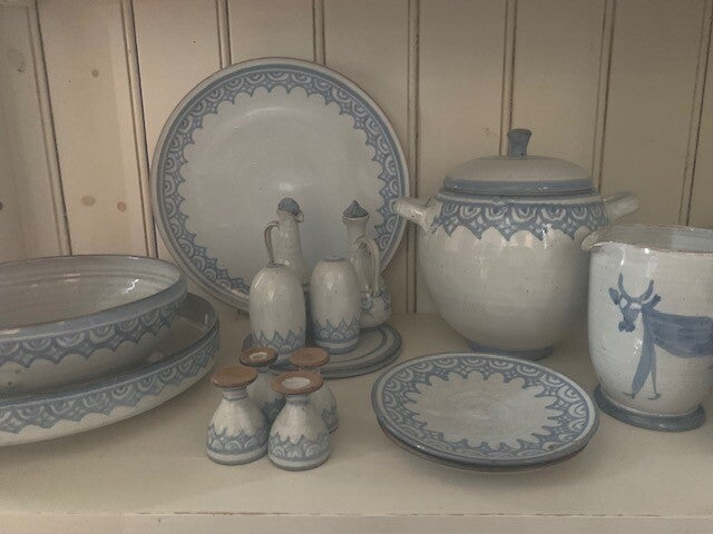 "Hoe ziet het er dan uit?" vraag ik. Irene zegt: "Nou, het is een blauw geglazuurd servies van rode klei, versiert met onder andere golfachtige krullen". "Gedraaid door pottenbakker Wim Jansen en beschilderd door zijn zwager Jan Koenen."