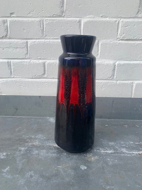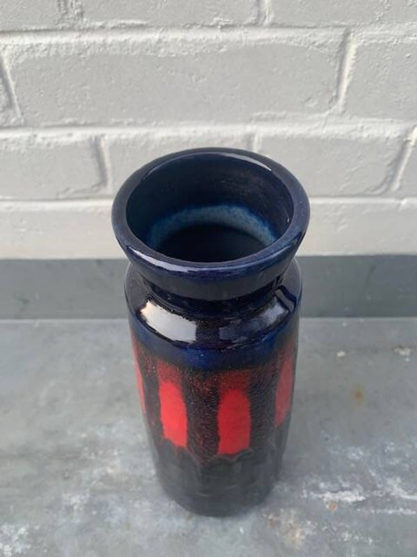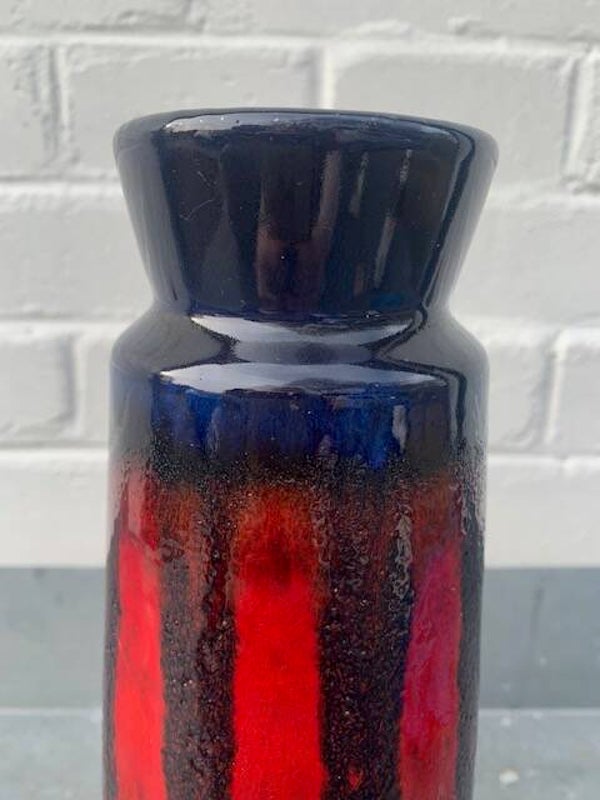 In glanzend rood en diverse blauwtinten, tegen het zwart aan