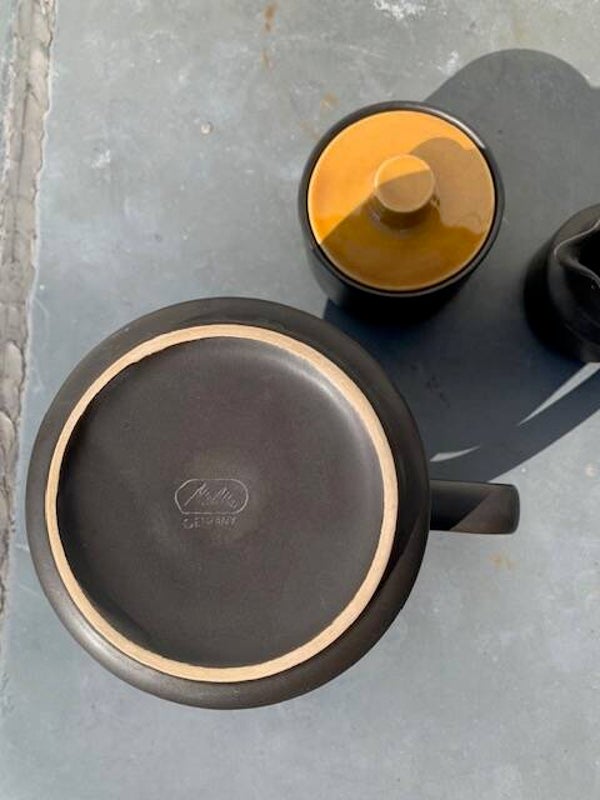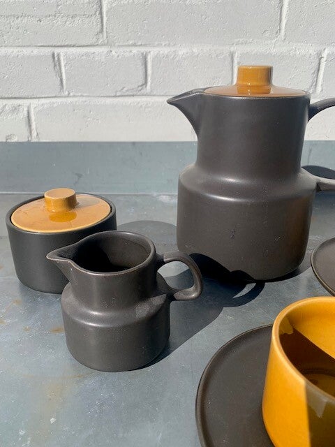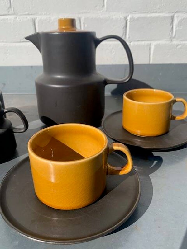 Set van koffiekan, twee kop en schotels, suikerpot en melkkan