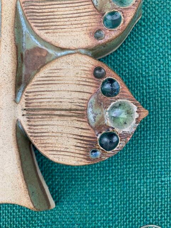 - Het keramiek is uitgevoerd in bruin en groen, soms tegen aquagroen aan