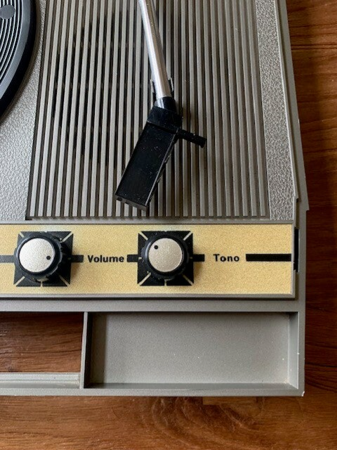- Met volume knop, hoog/laag hendel voor de naald, toerenschuif en dop welke omhoog/omlaag kan voor the afspelen van singles of LP's
