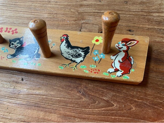 Met afbeeldingen van een lammetje, eend, hond, poes, kip en konijn