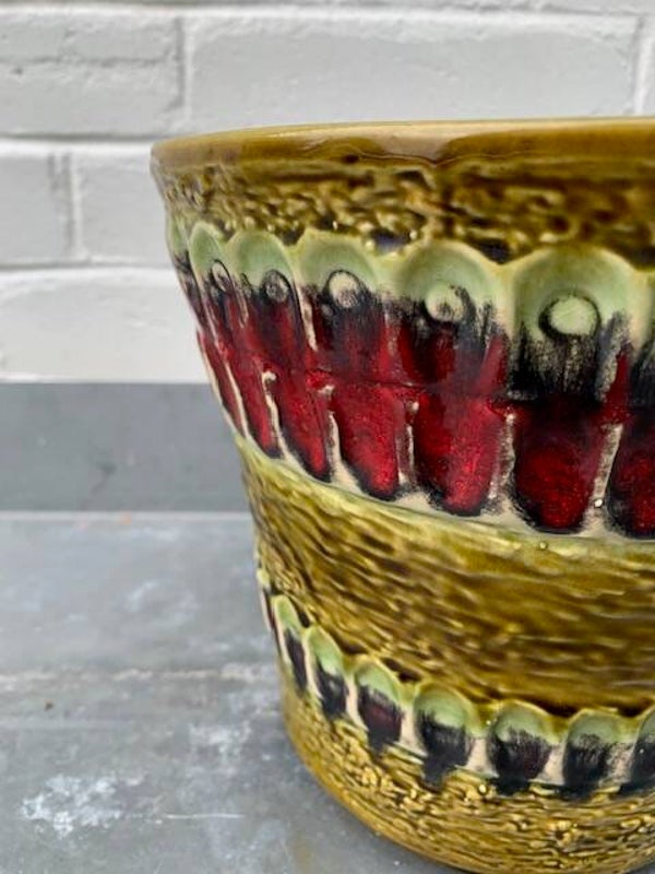 Mooie bloempot in linde- en augurkengroen, rood en zwart
