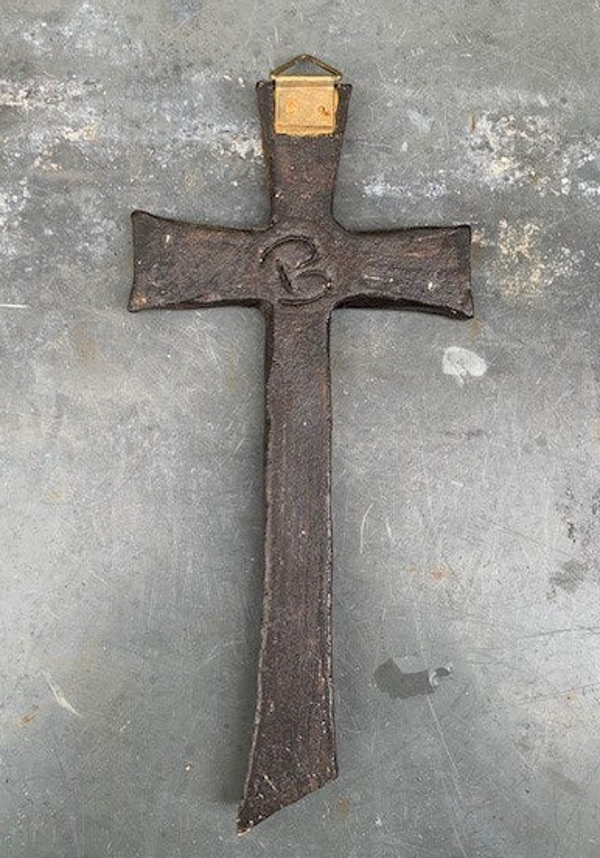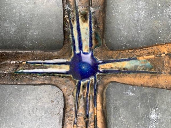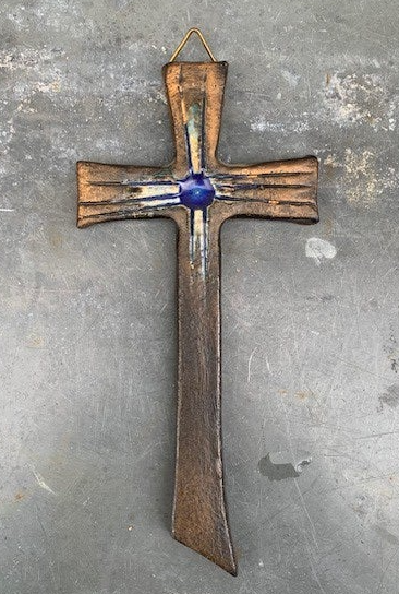 Mooi kruisje met glanzend kobalt/ivoor glazuur op bruin/brons ondergrond
