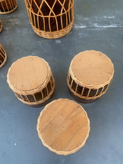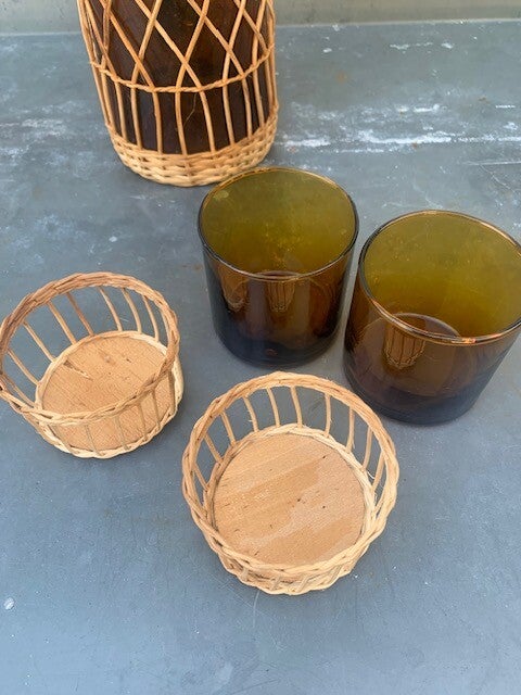 Set van waterkan en 8 glazen, rieten houders