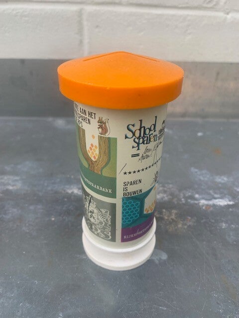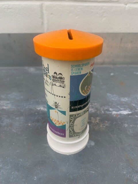 - Met ruimte om een stickertje te plakken met jouw eigen naam en teksten als schoolsparen is leren sparen, sparen is bouwen voor jezelf en voor je land, en er ligt geld op u te wachten, denk aan de rentebijschrijving