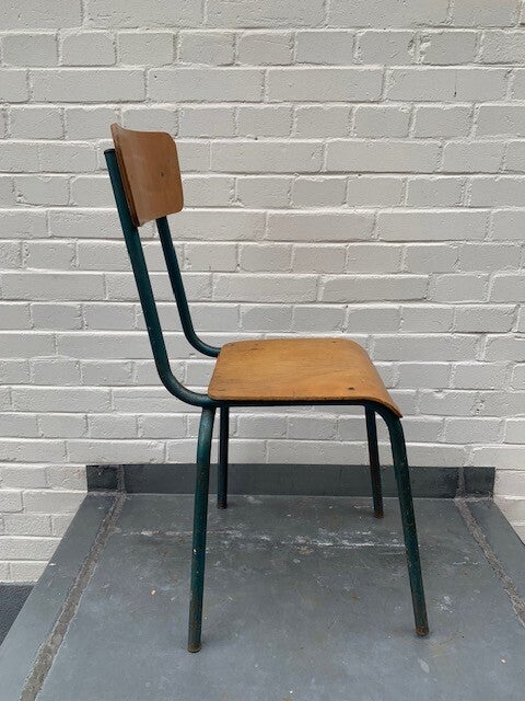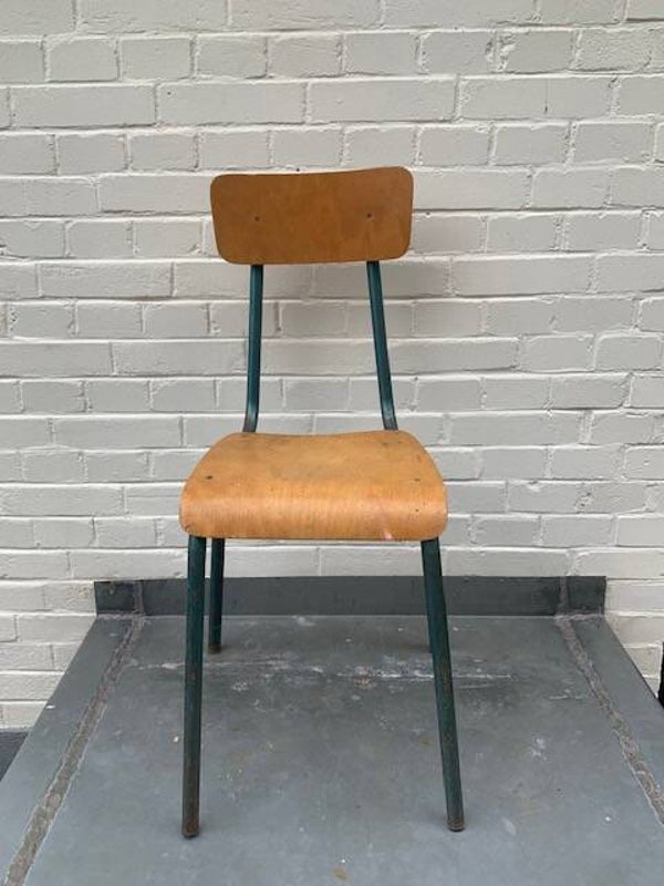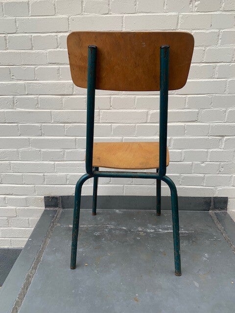 Blauw gekleurd metaal en grenen kleurig fineren zitting en rug leuning