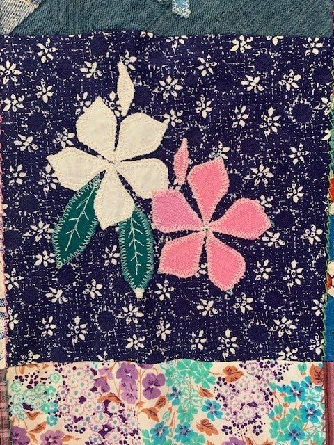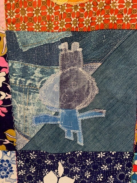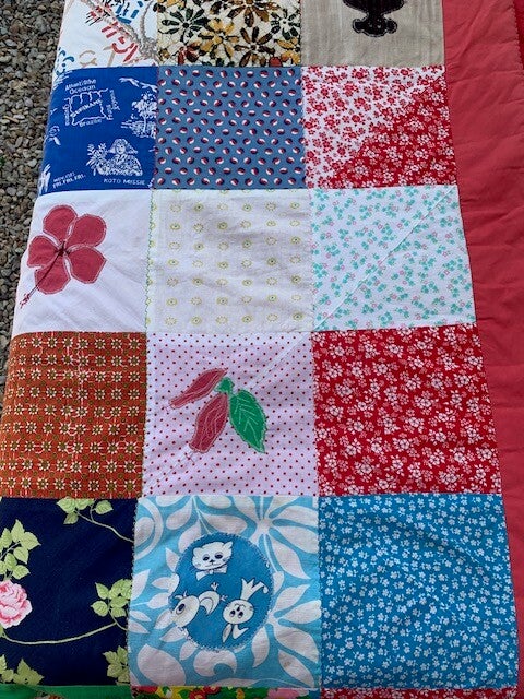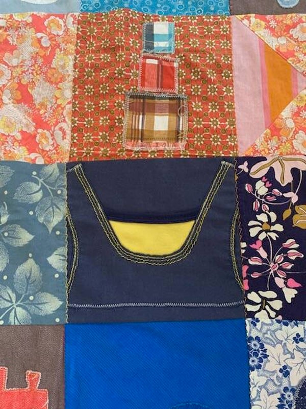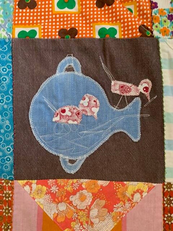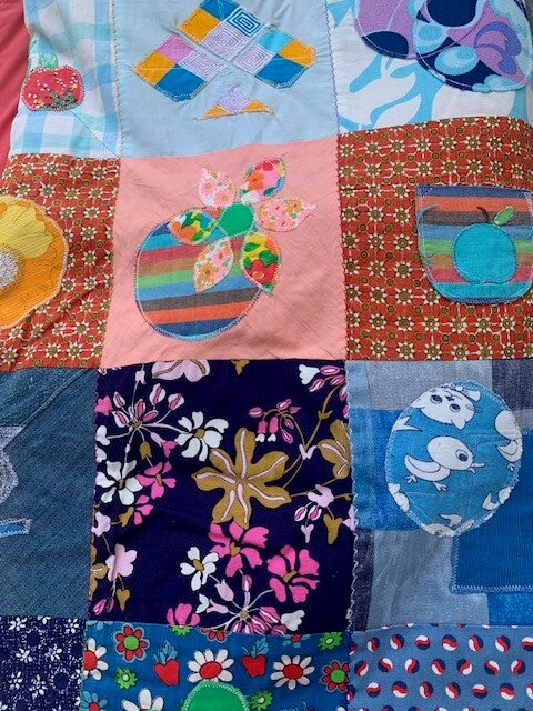 - Patchwork, 99 (bewerkte) lapjes stof uit de '60-'70er jaren, zijn hiervoor gebruikt