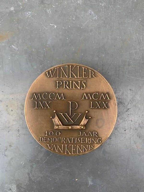 - Tekst achterzijde: Latijne getallen MCCMLLX en MCMLXX (1870 en 1970) en het monogram van Winkler Prins
