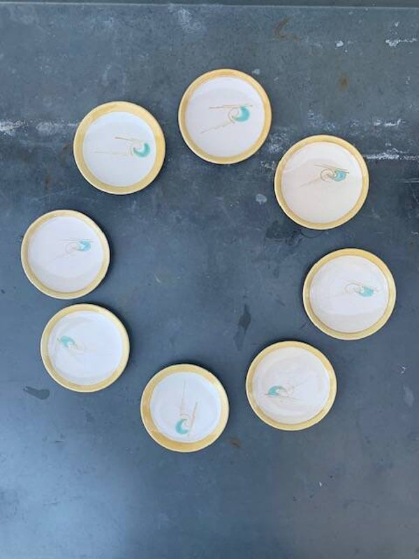 - 8 handgemaakte en beschilderde bordjes in ivoor met zacht gele rand en Abstracte figuur in zacht geel en turquoise.