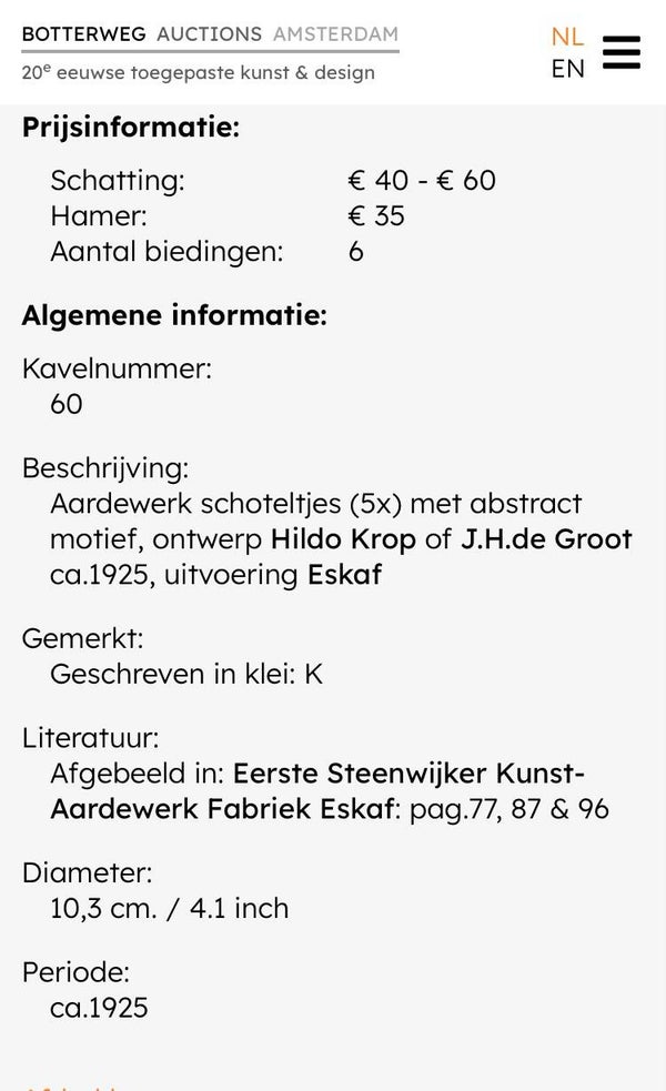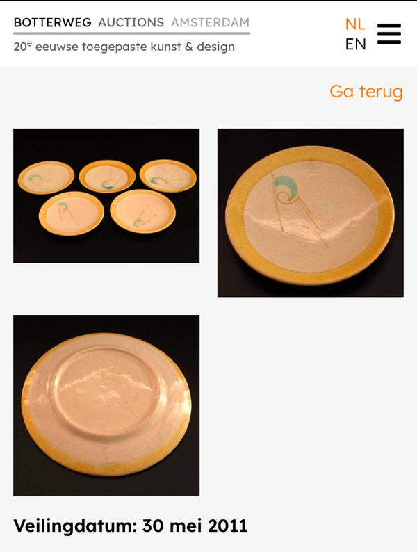 (In 2011, brachten 5 van deze bordjes €35,= op op een veiling van Botterweg Auctions Amsterdam, zie de foto's)