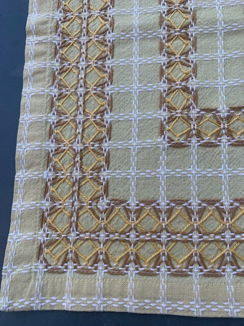 Lichtgeel met wit beiersbont, geborduurd met bruin en geel