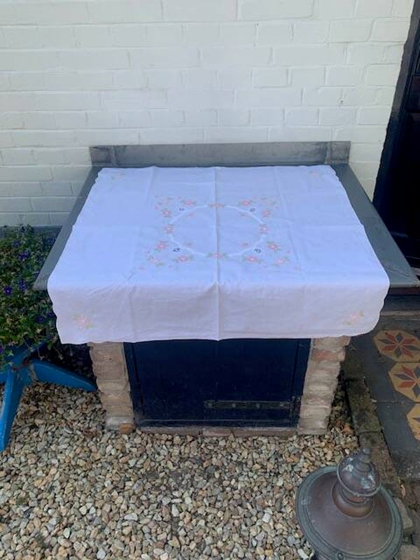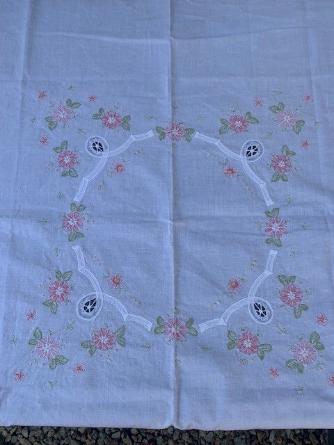 Geborduurd met roze en groene bloemen, gele stipjes en opengewerkt