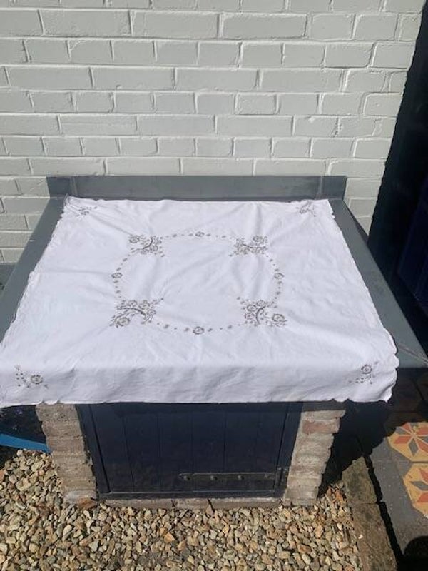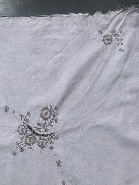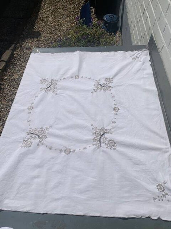 Mooi wit tafelkleedje met beige kleurige borduursels