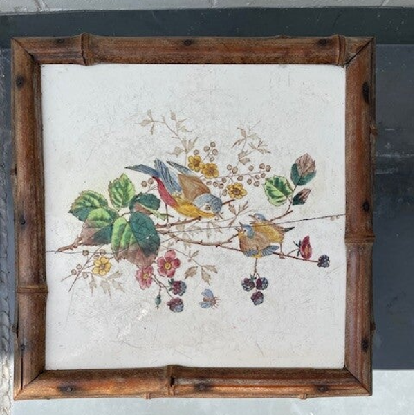- Op de tegel zijn een moedervogel, twee kleintjes en bramenstruiken te zien