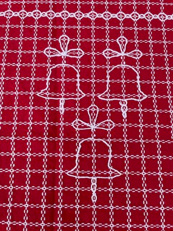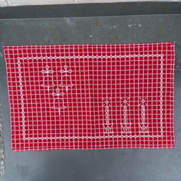 Kleedje geborduurd met kerstmotieven als klokjes en kaarsen