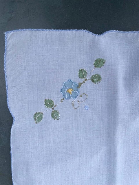 Wit katoen met gestempelde en omnaaide bloemenen blaadjes in groen, blauw en geel