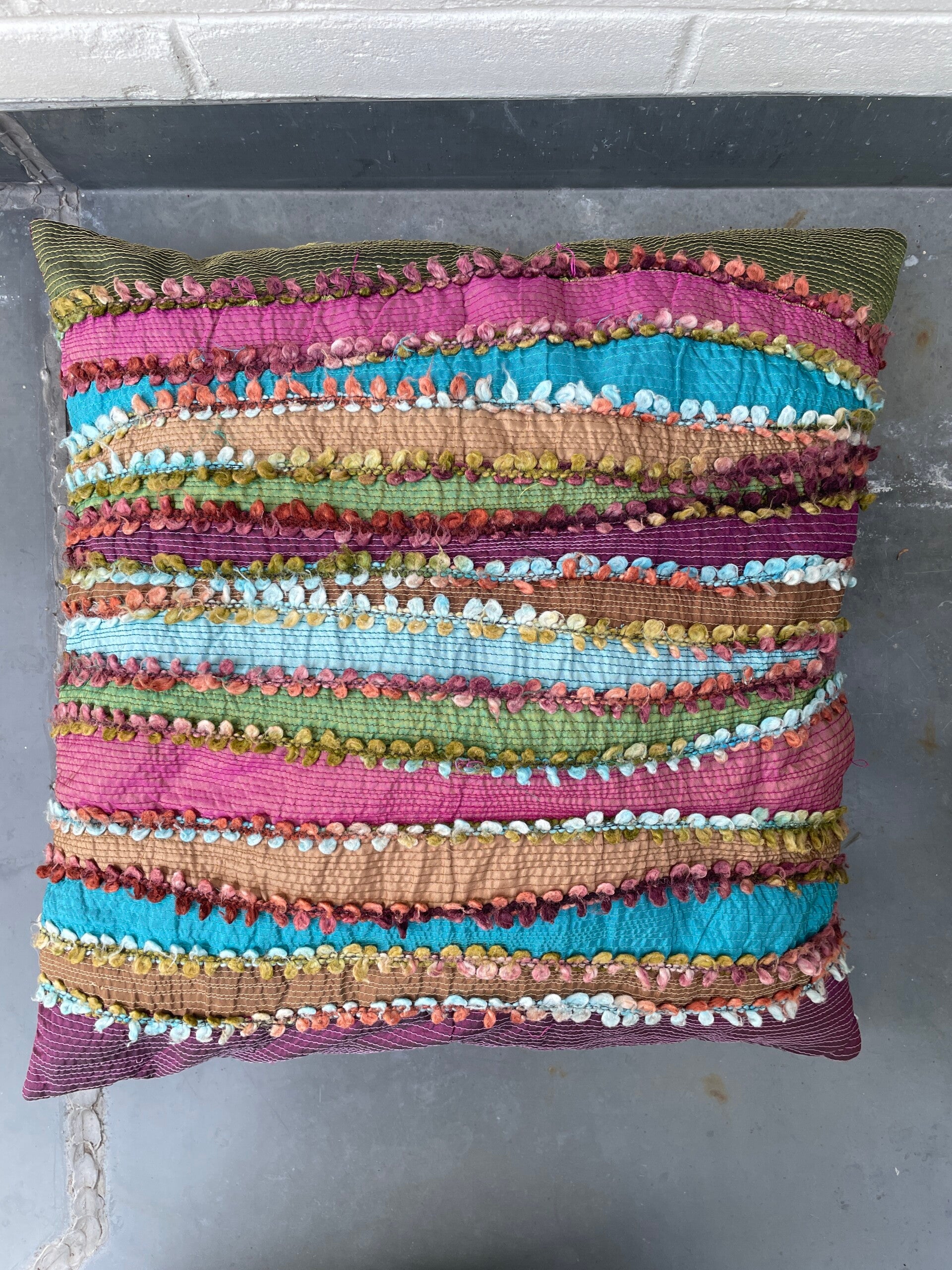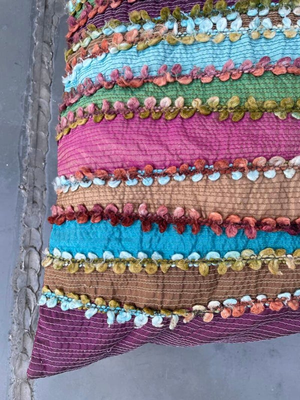 Handgemaakt kussen van diverse doorgestikte lapjes stof en versierd met bouclé band (lusjes)