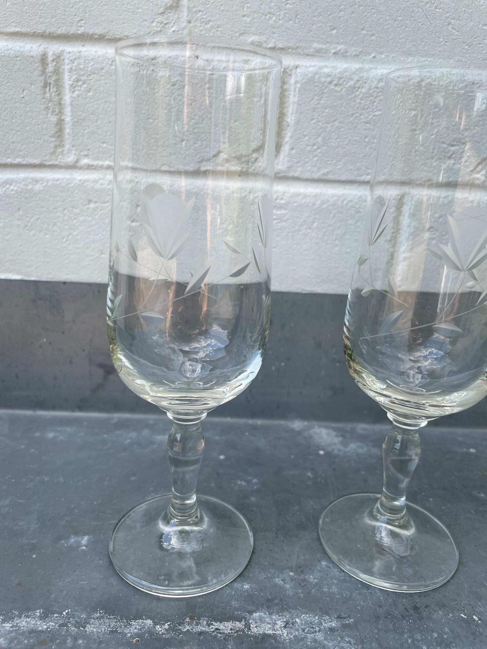 Glas is mondgeblazen en gegraveerd met sierlijke bloemmotieven
