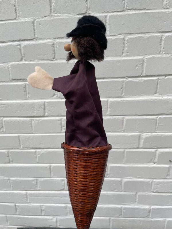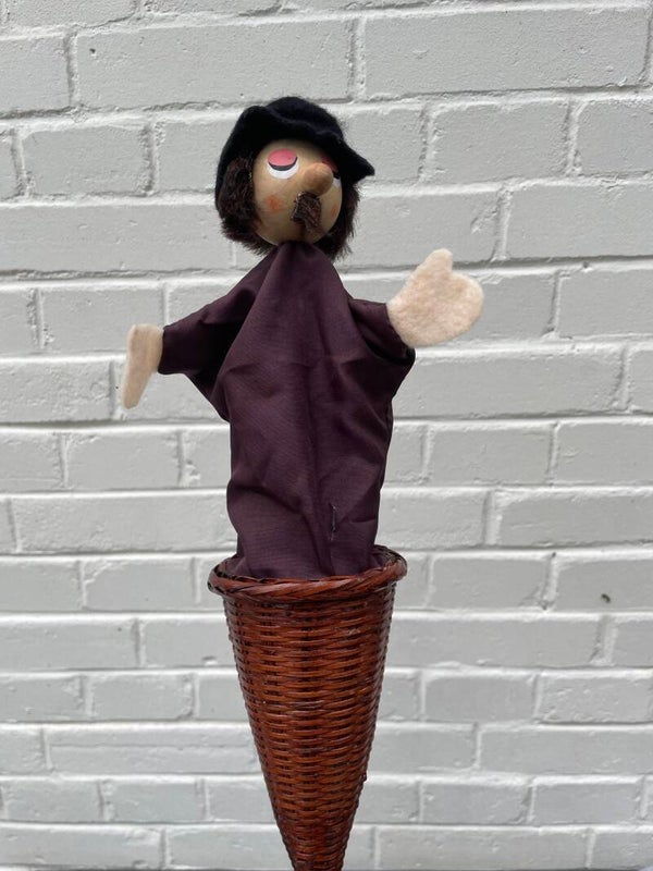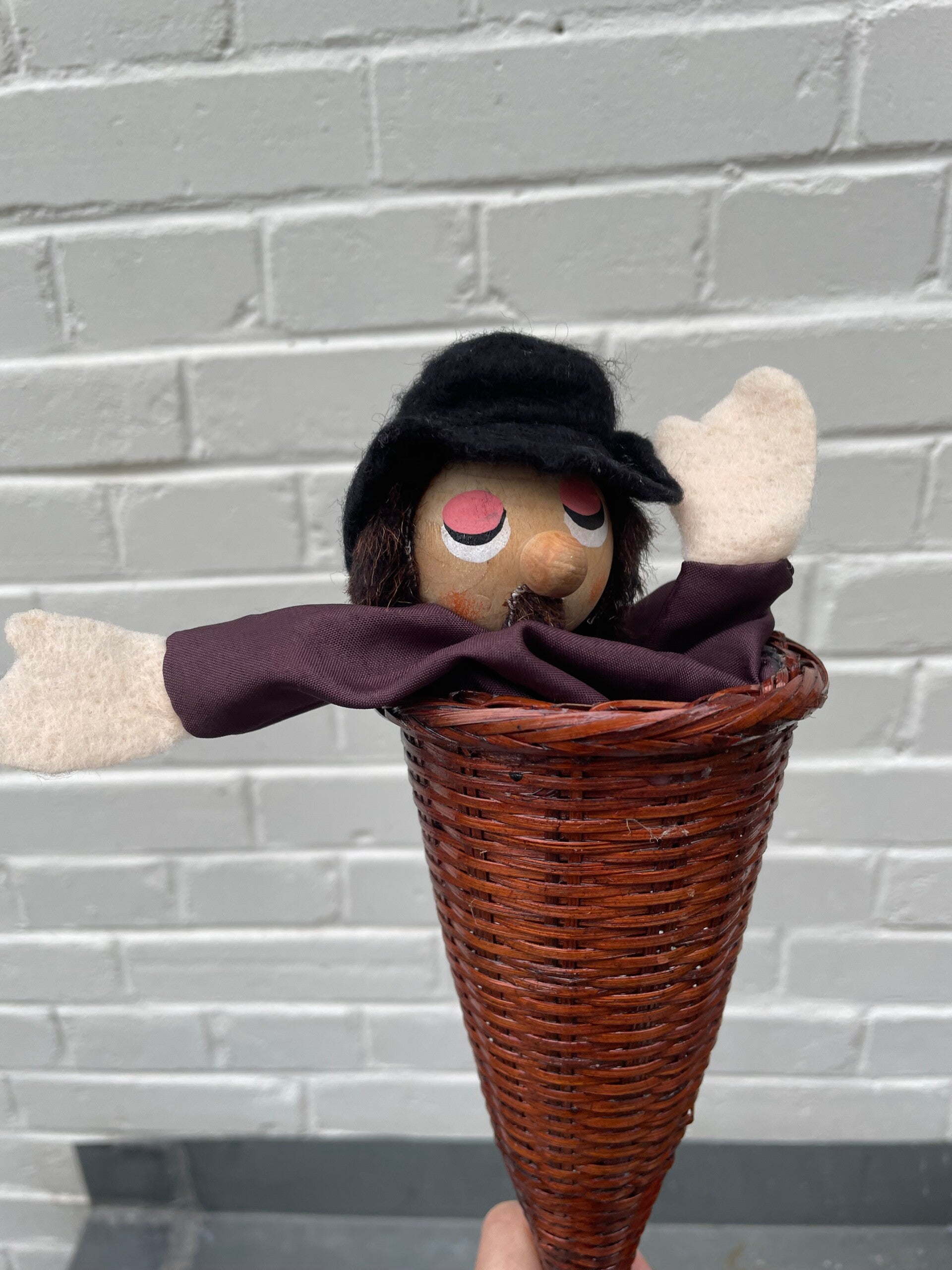 Wat een leukerd, een stokpop in de vorm van een mannetje met hoed en snor