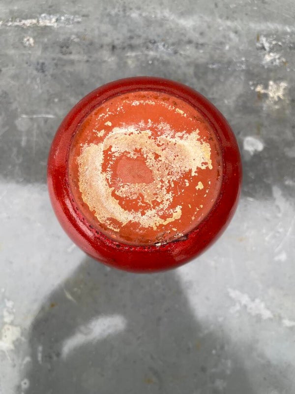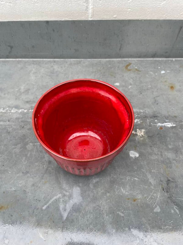 Potje is uitgevoerd in glanzend rood met verticale zwarte lijnen