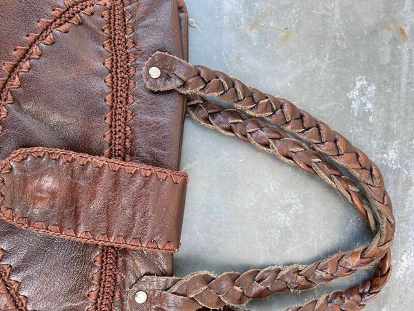 Gemaakt van aan elkaar gehaakte (skai?) donkerbruin leren vlakken (patchwork)