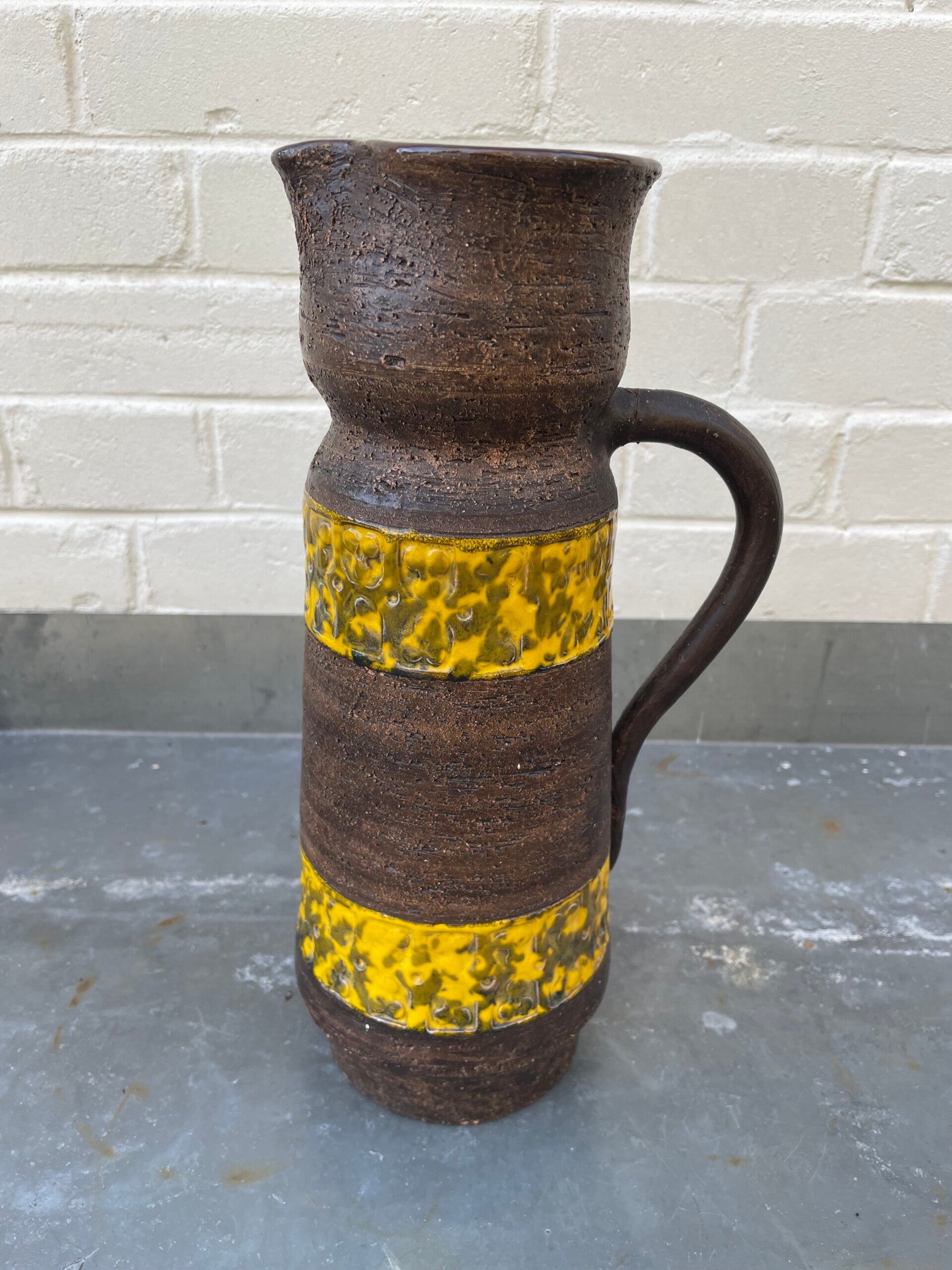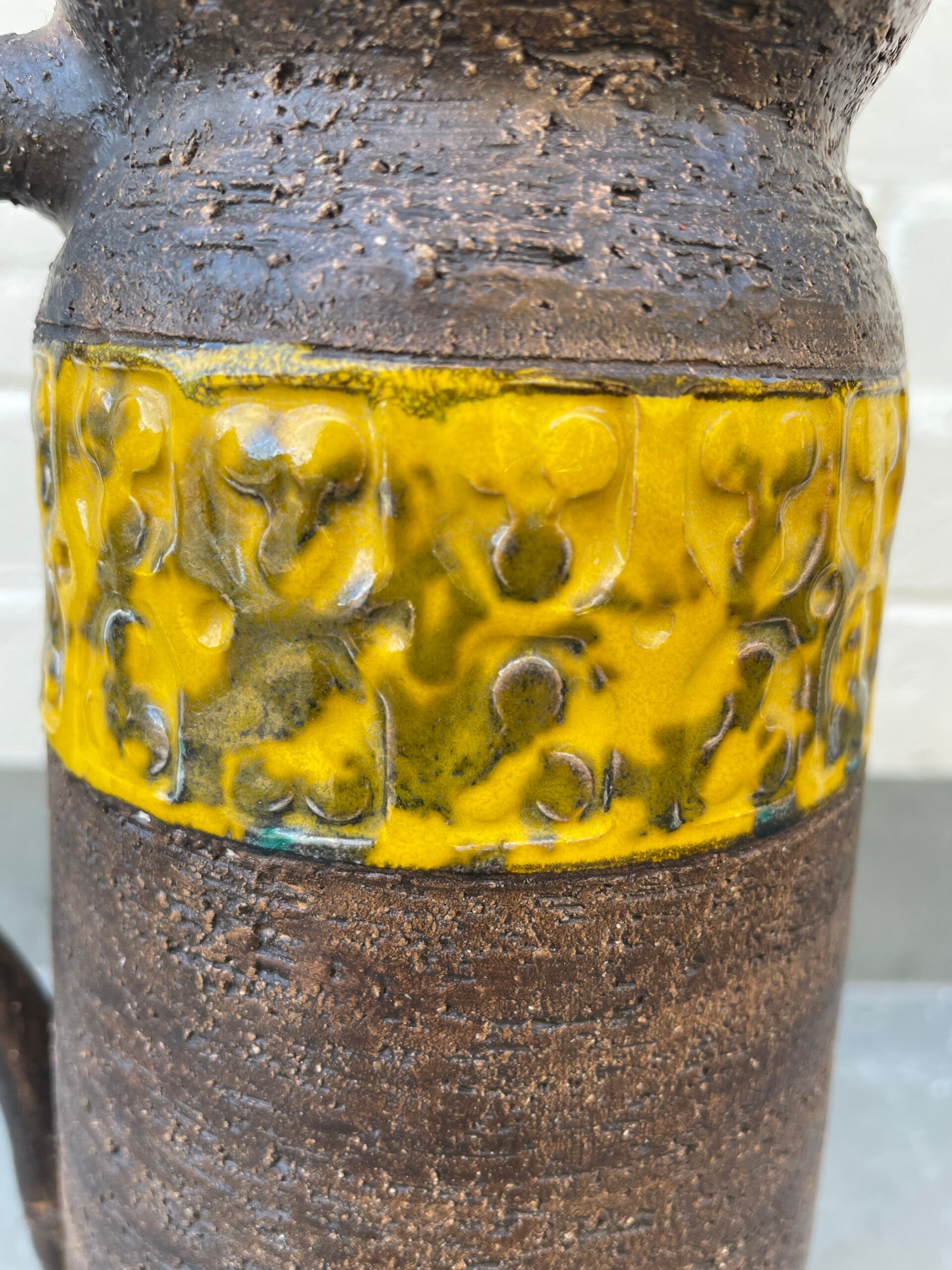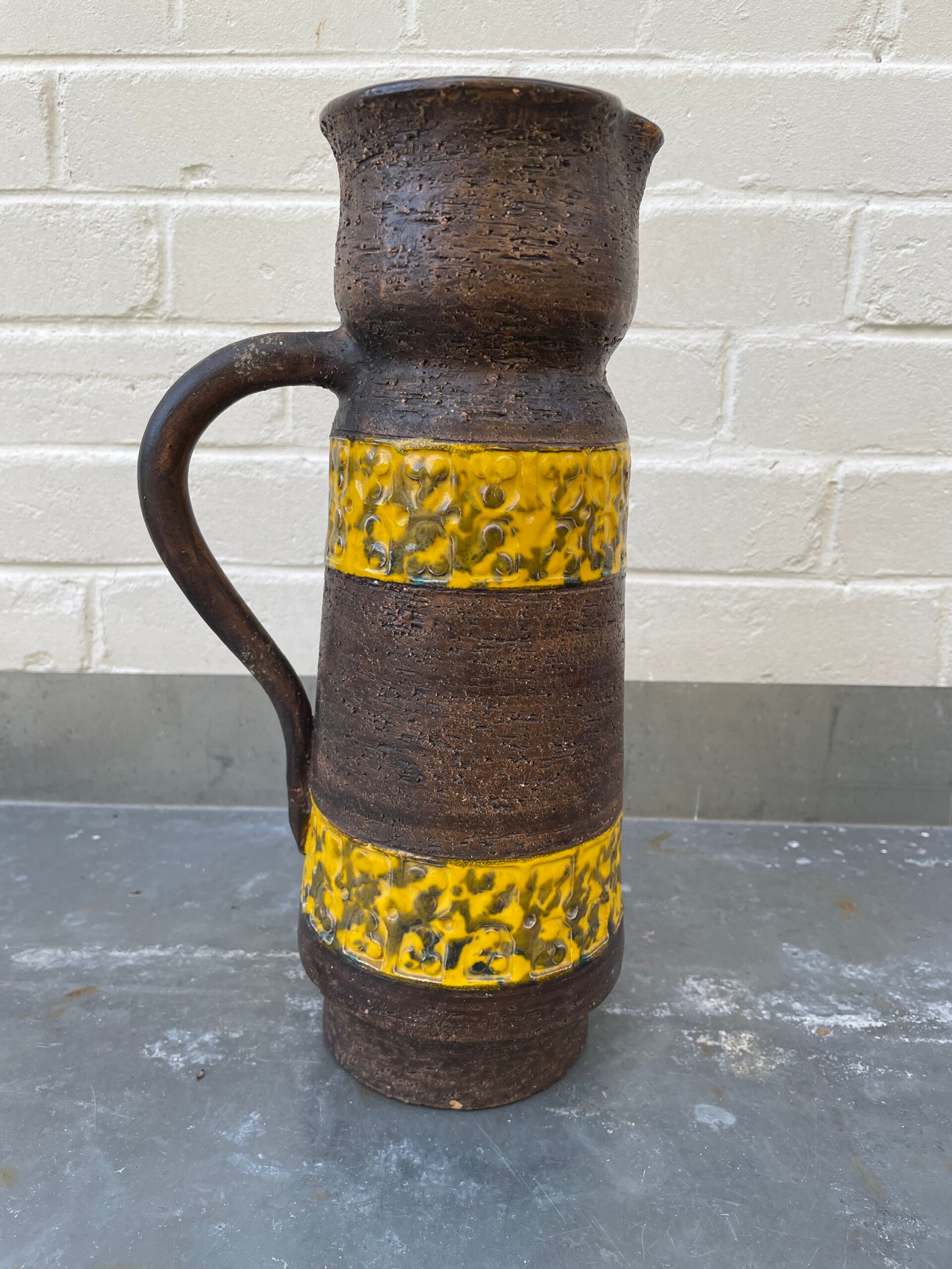 Mooie mat bruine schenkkan met twee gele 'banden' met geometrische vormen