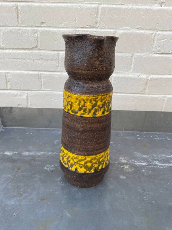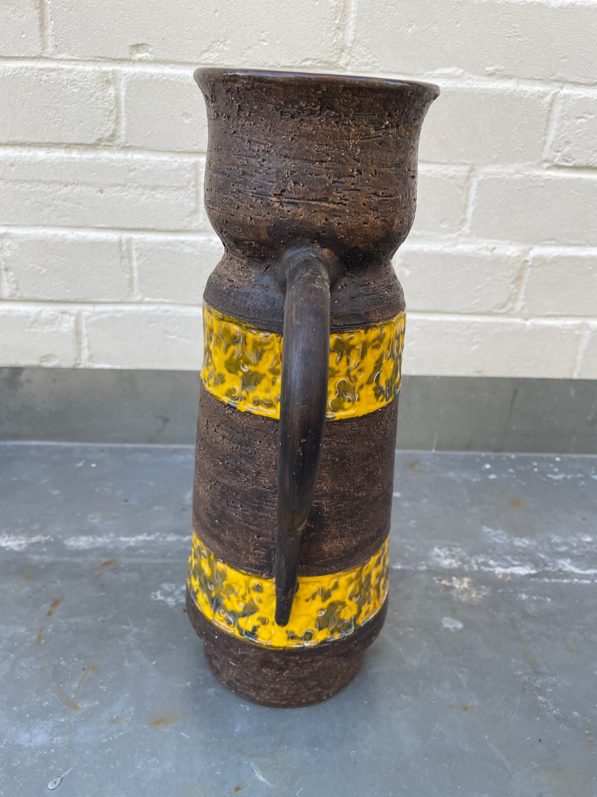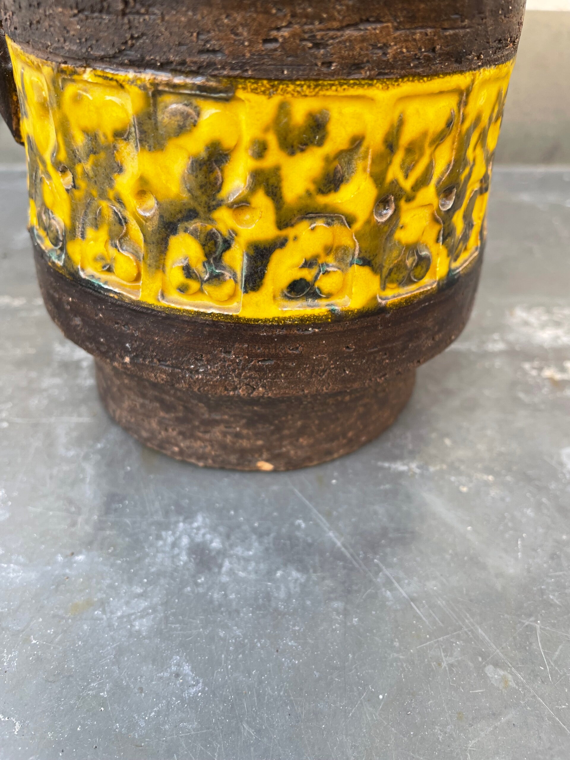 Mooie mat bruine schenkkan met twee gele 'banden' met geometrische vormen