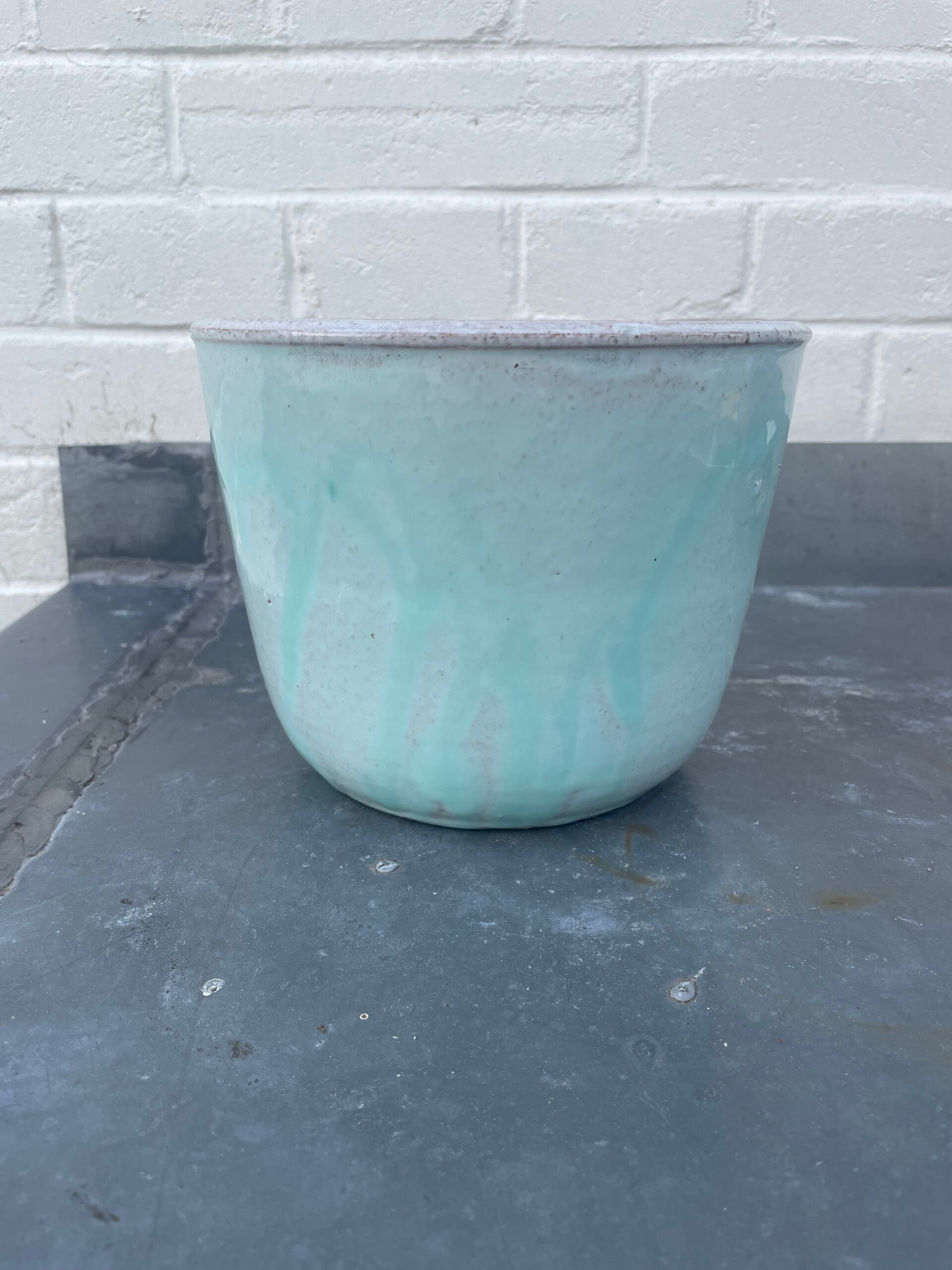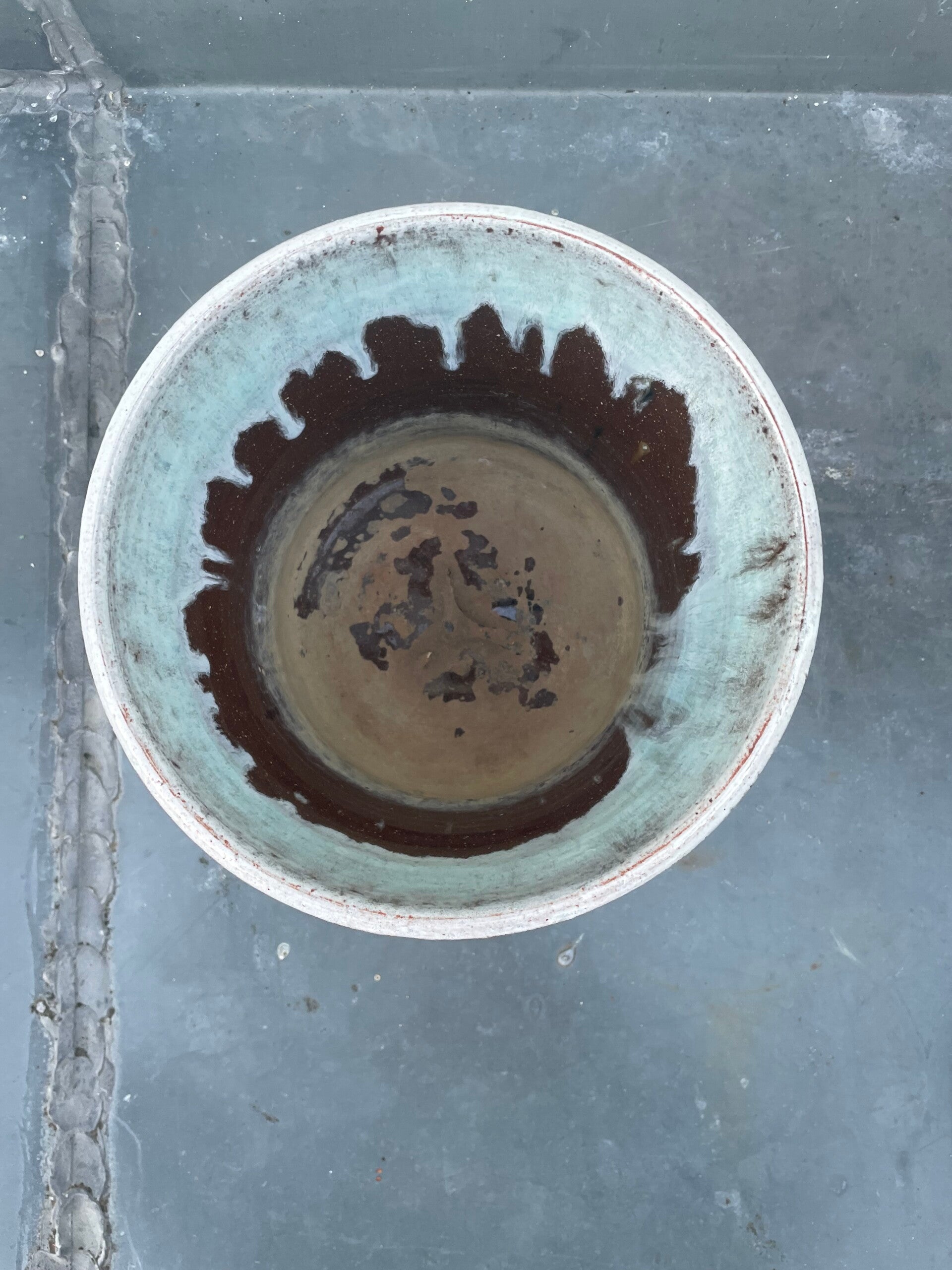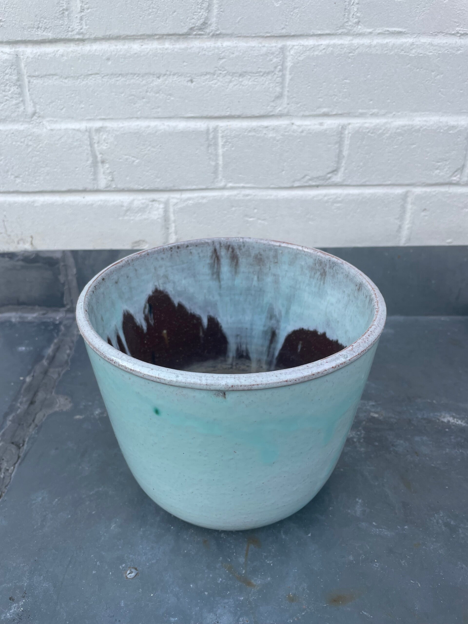 Binnenzijde bruin geglazuurd, met mintgroen drip aan bovenbinnenzijde