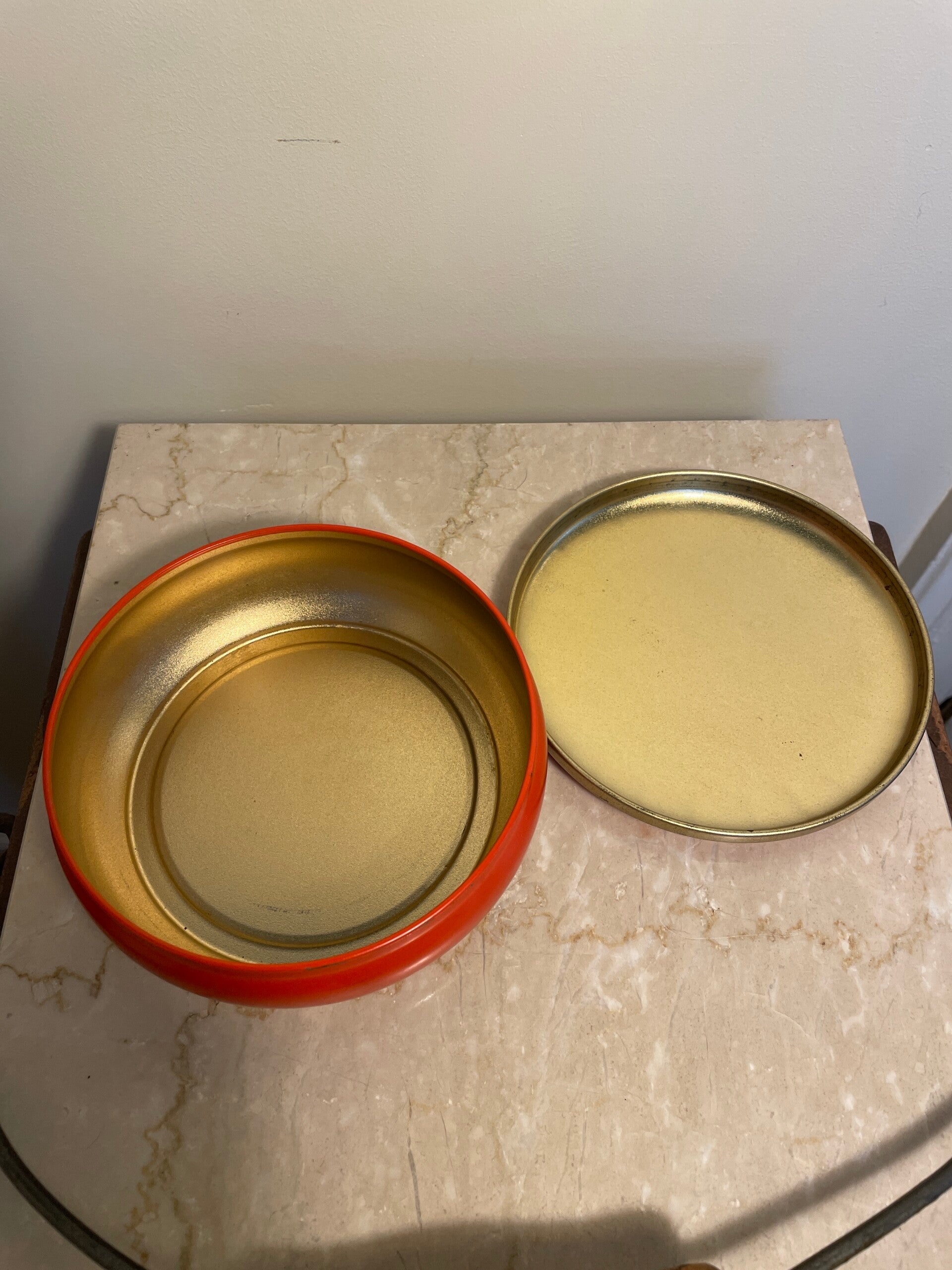 Het deksel heeft een krasje en verder heeft het blikje gebruikssporen conform de leeftijd