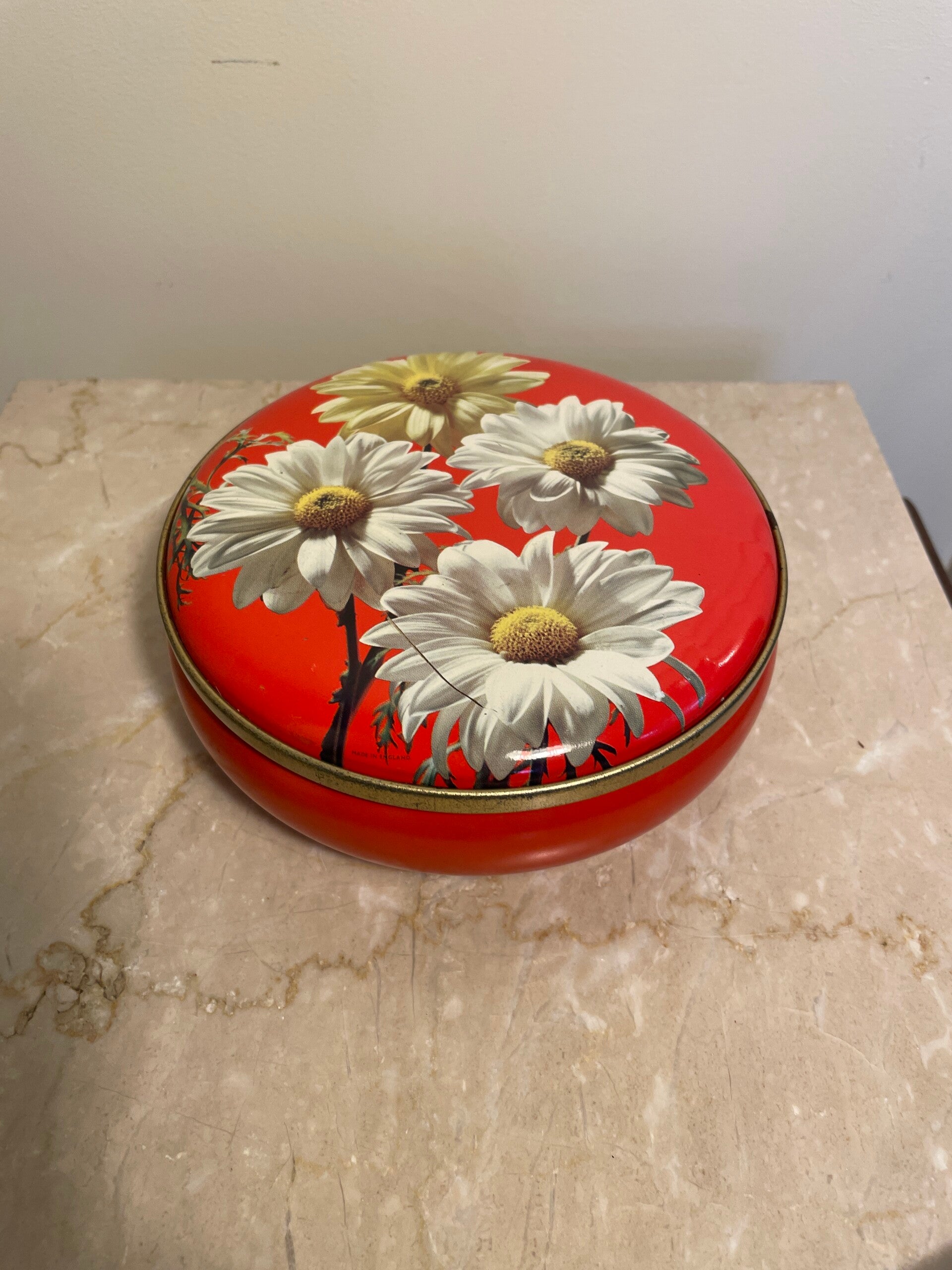 Rood en rond blikje met afbeelding van gele en witte margrieten