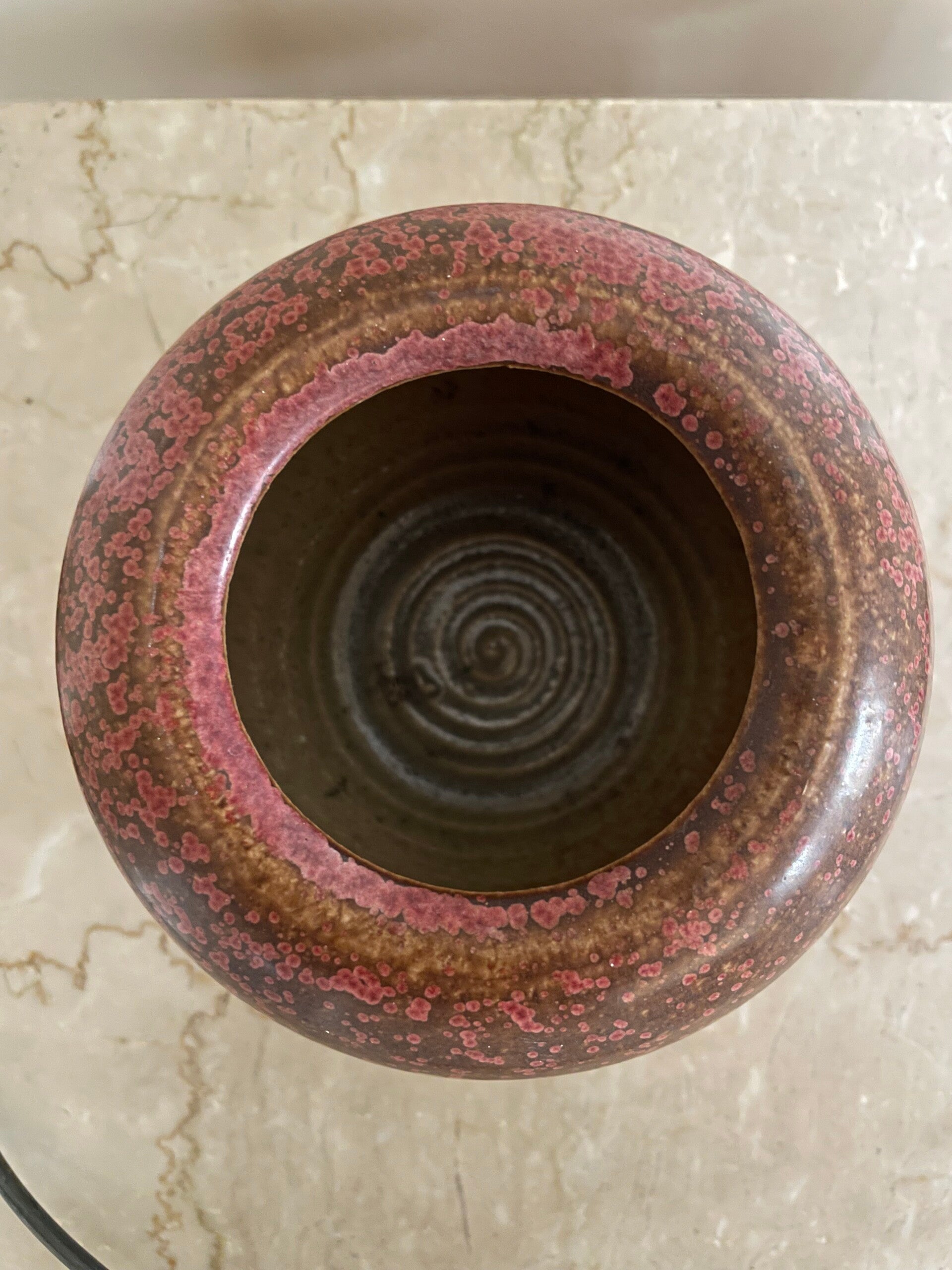 Bruine glazuurondergrond met roze spat effect rondom