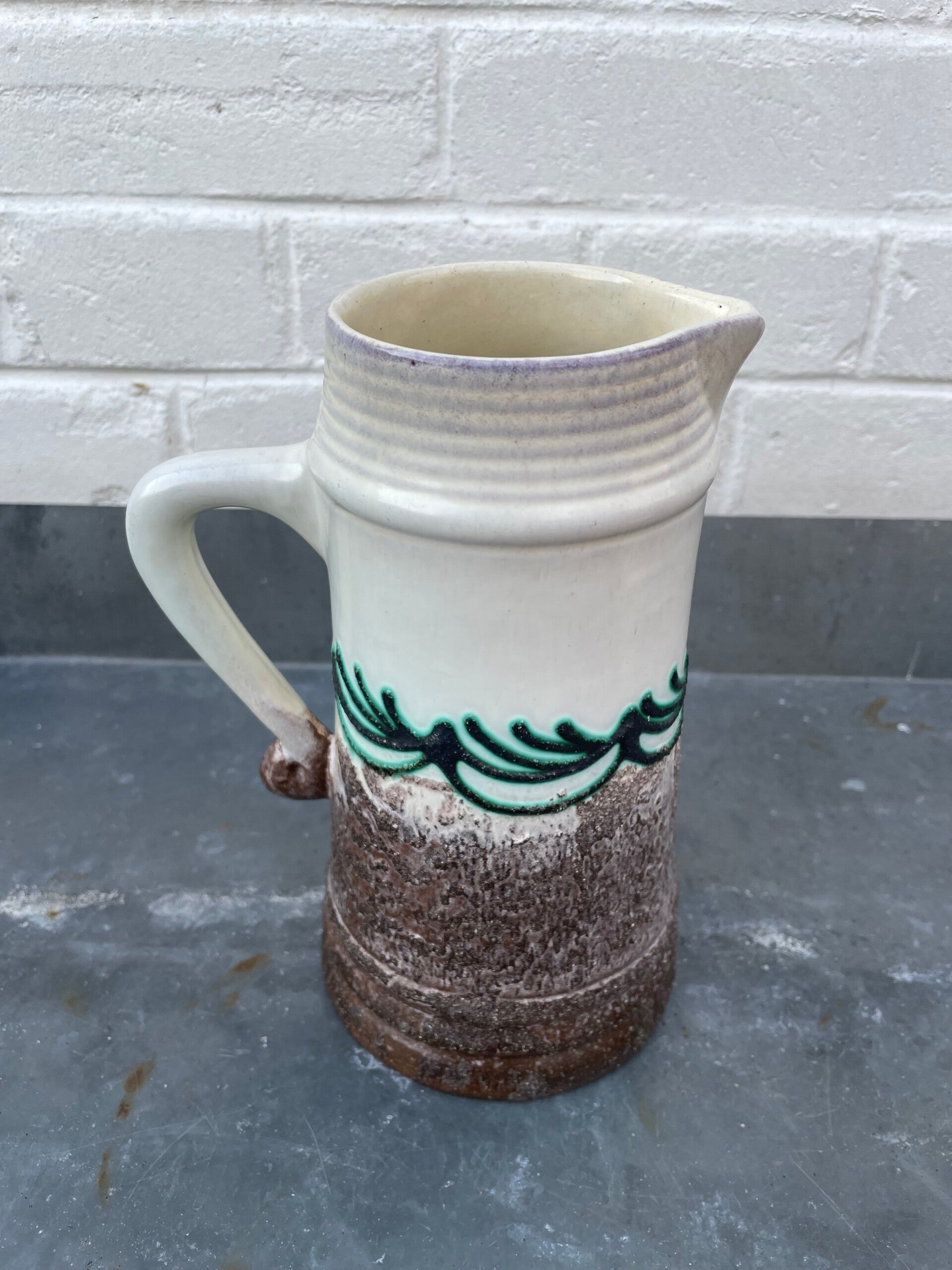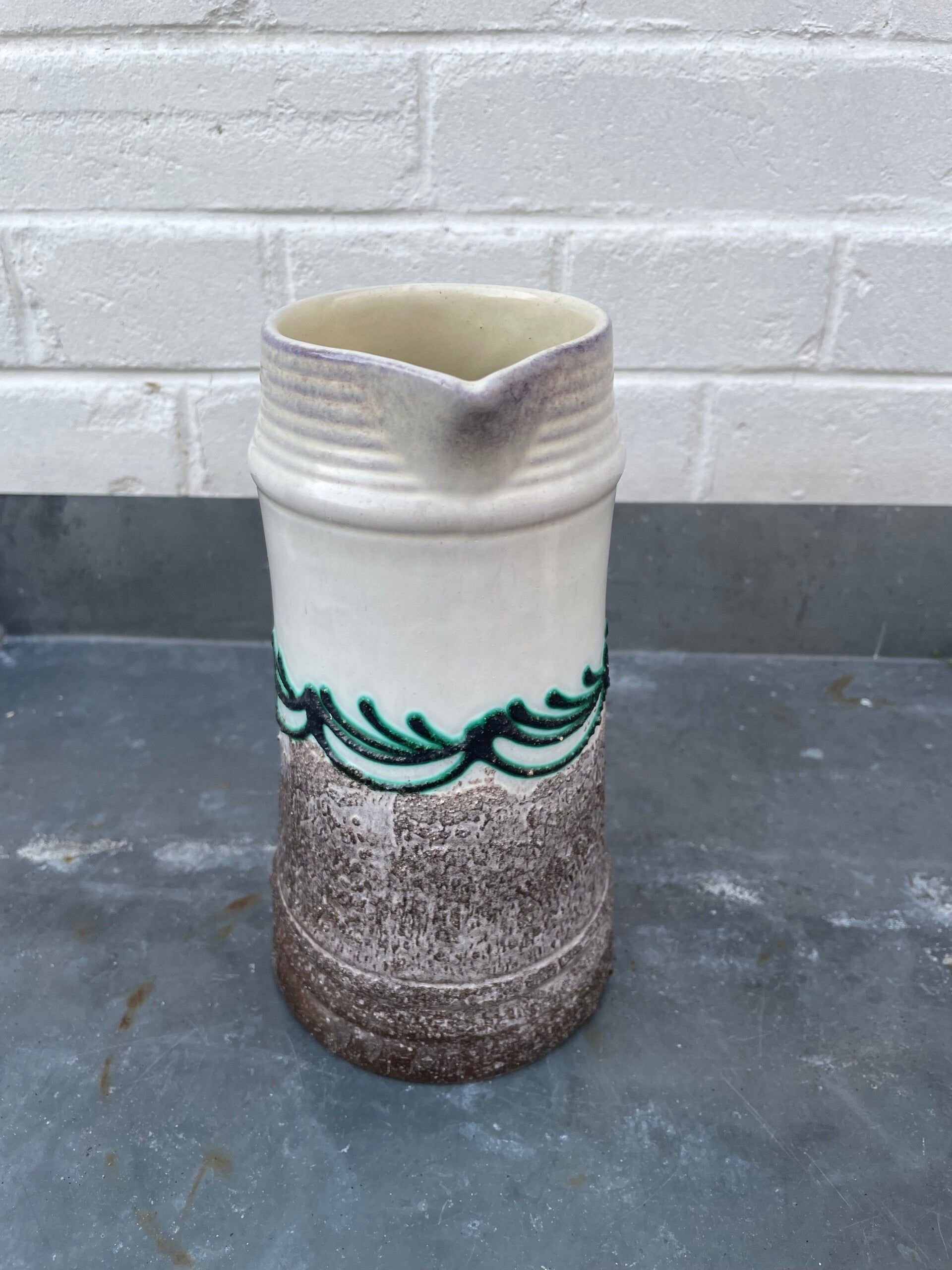 In mat ivoor en taupekleurig zandglazuur en dikke laag sierlijke zwarte en aquagroene lijnen