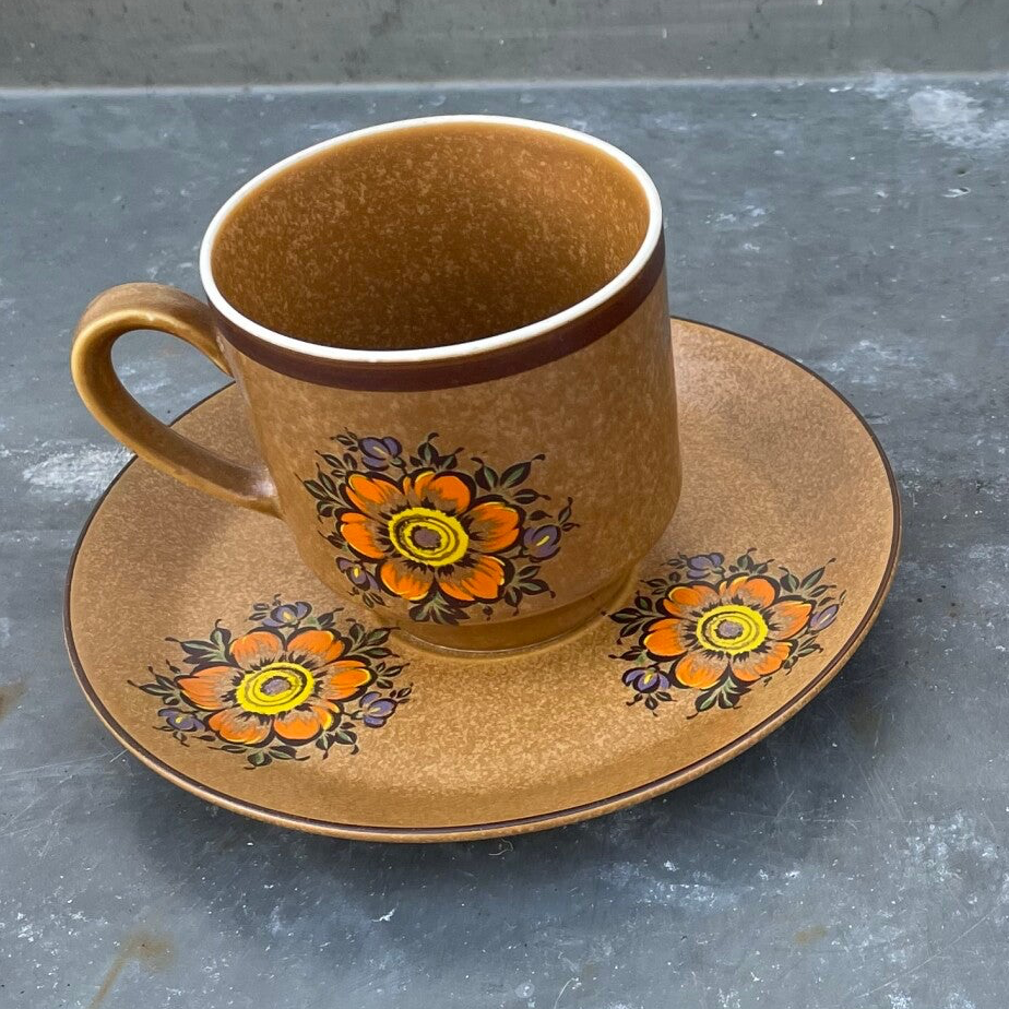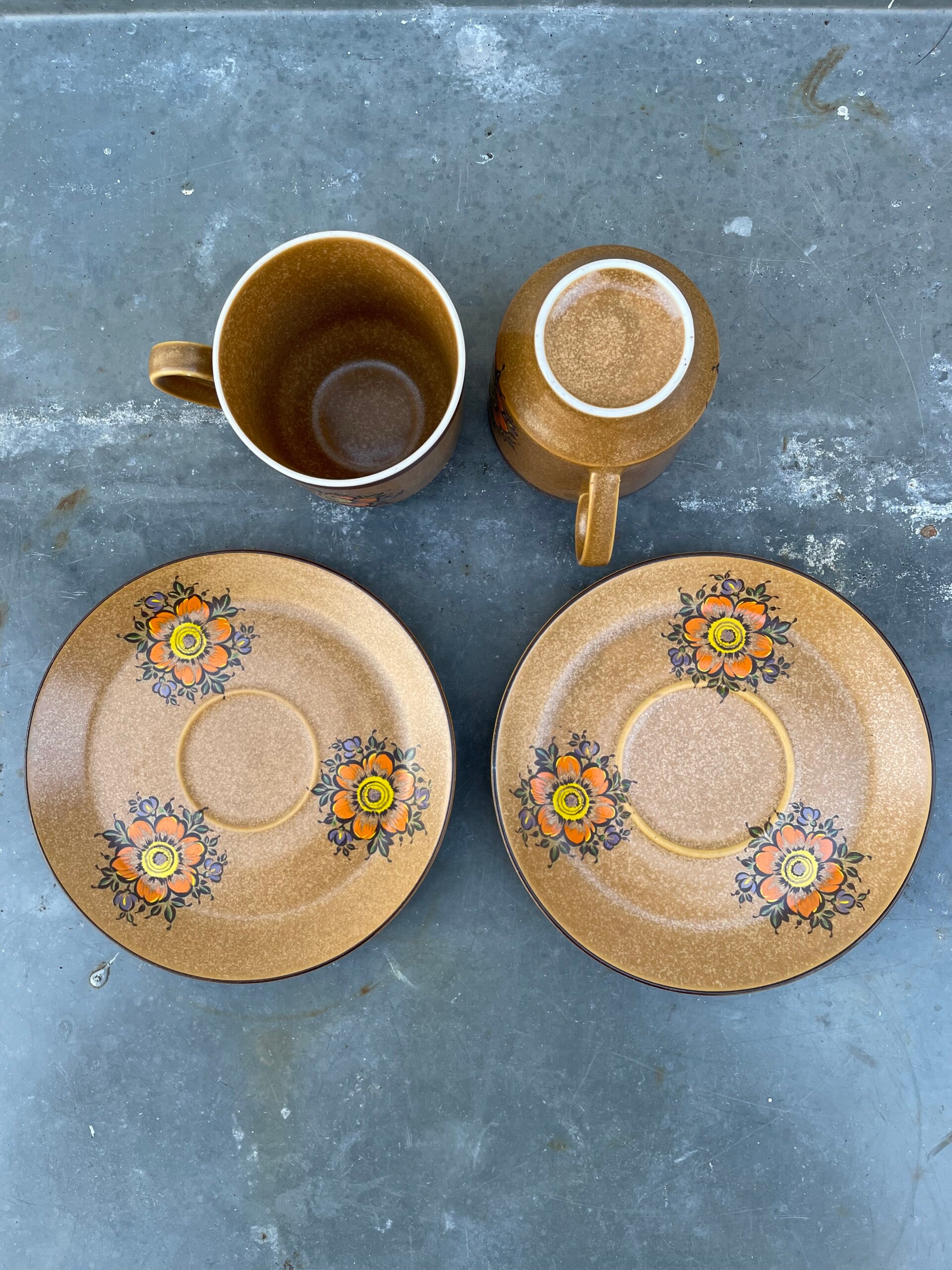- Eén schoteltje heeft een grotere ronding voor het kopje dan de andere; vermoedelijk heeft hier een andere vorm kopje op gehoord. Verder in perfecte staat
