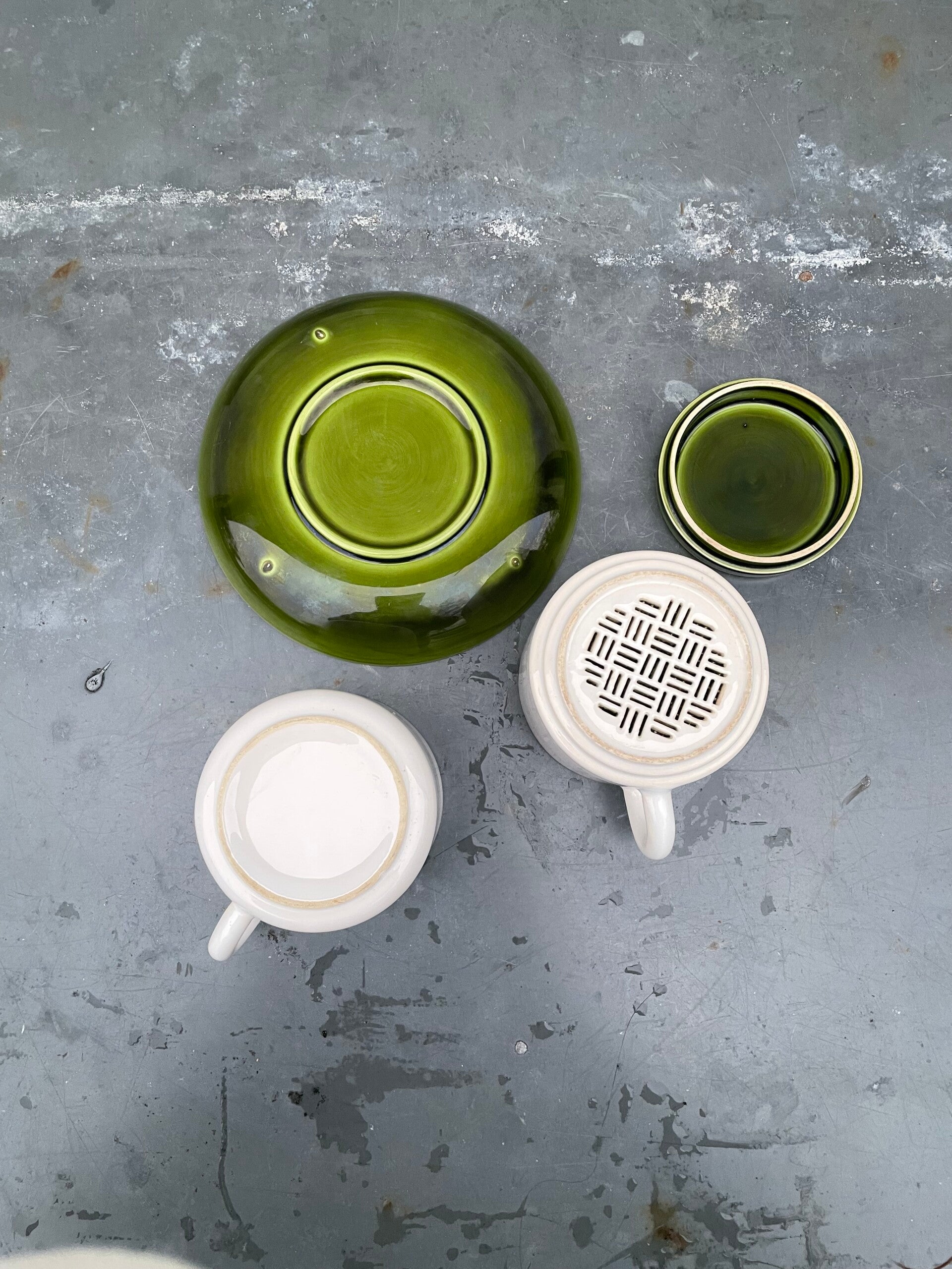 - In wit met groen, binnenzijde van de kopjes is groen geglazuurd terwijl de buitenzijde wit is