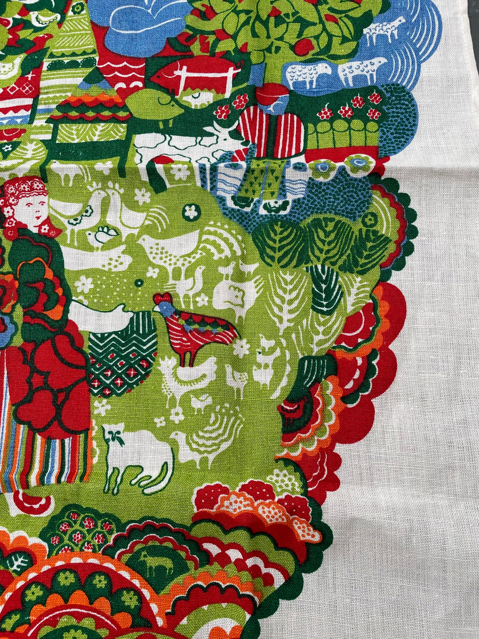 - Met afbeelding in blauw, groen, rood, wit en oranje van een boerin met heel veel boerderijdieren en zelfs de boer