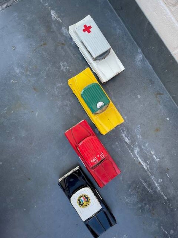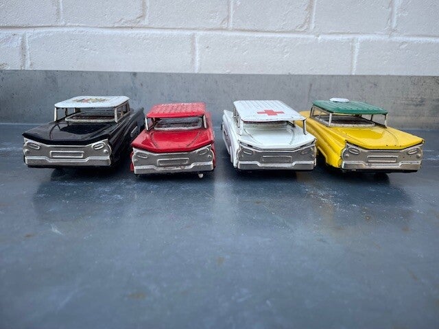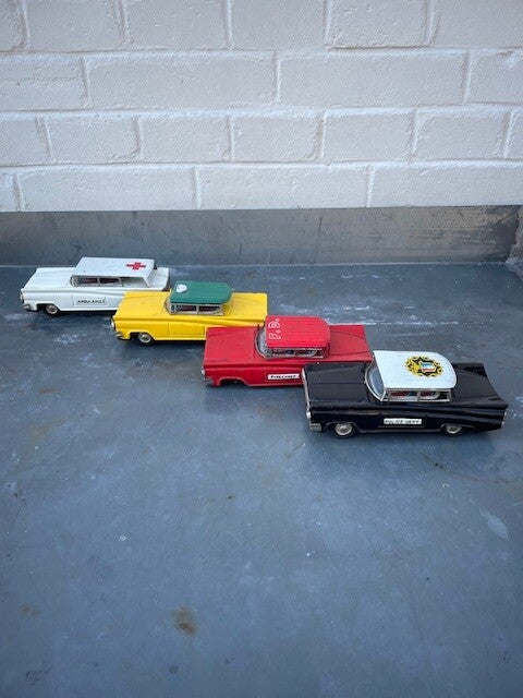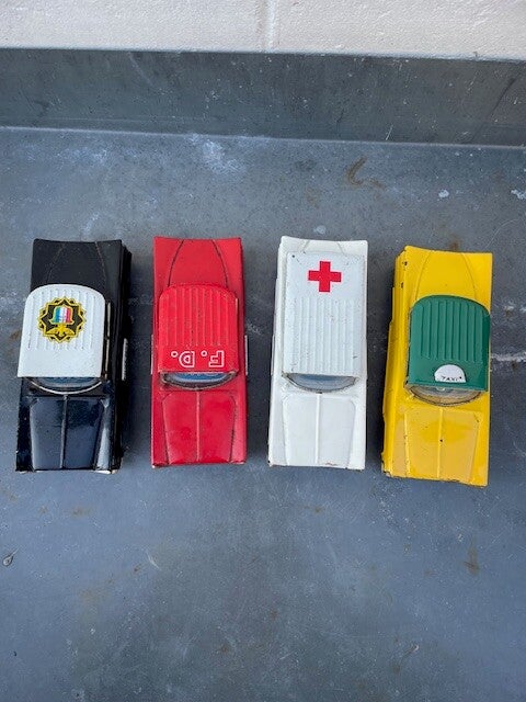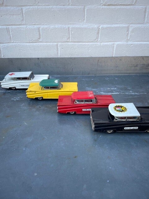 - De set bestaat uit een zwart witte politieauto (Police Dept./Highway Patrol), een rode brandweerauto (Fire Chief/F.D.), een witte Ambulance en een geel/groene Taxi