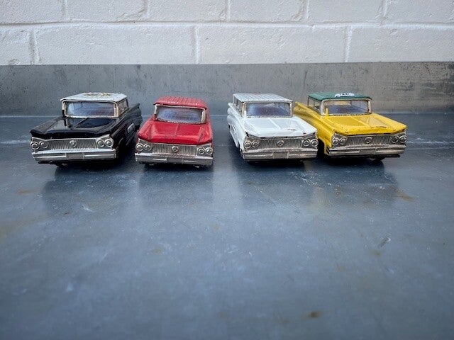 - Conditie: gezien de leeftijd zeer goed, geen missende onderdelen (alle wielen, interieurplaatje en zelfs de kunsstoffen voorruiten zijn bij alle vier nog aanwezig)
