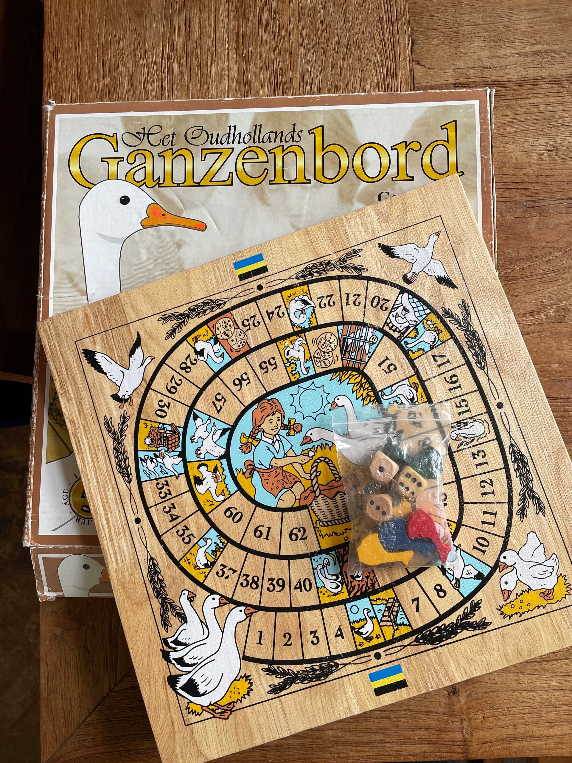 Echt houten bord, 4 houten gansjes en dobbelstenen