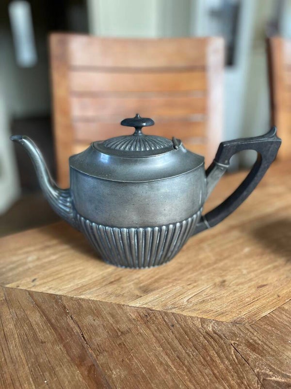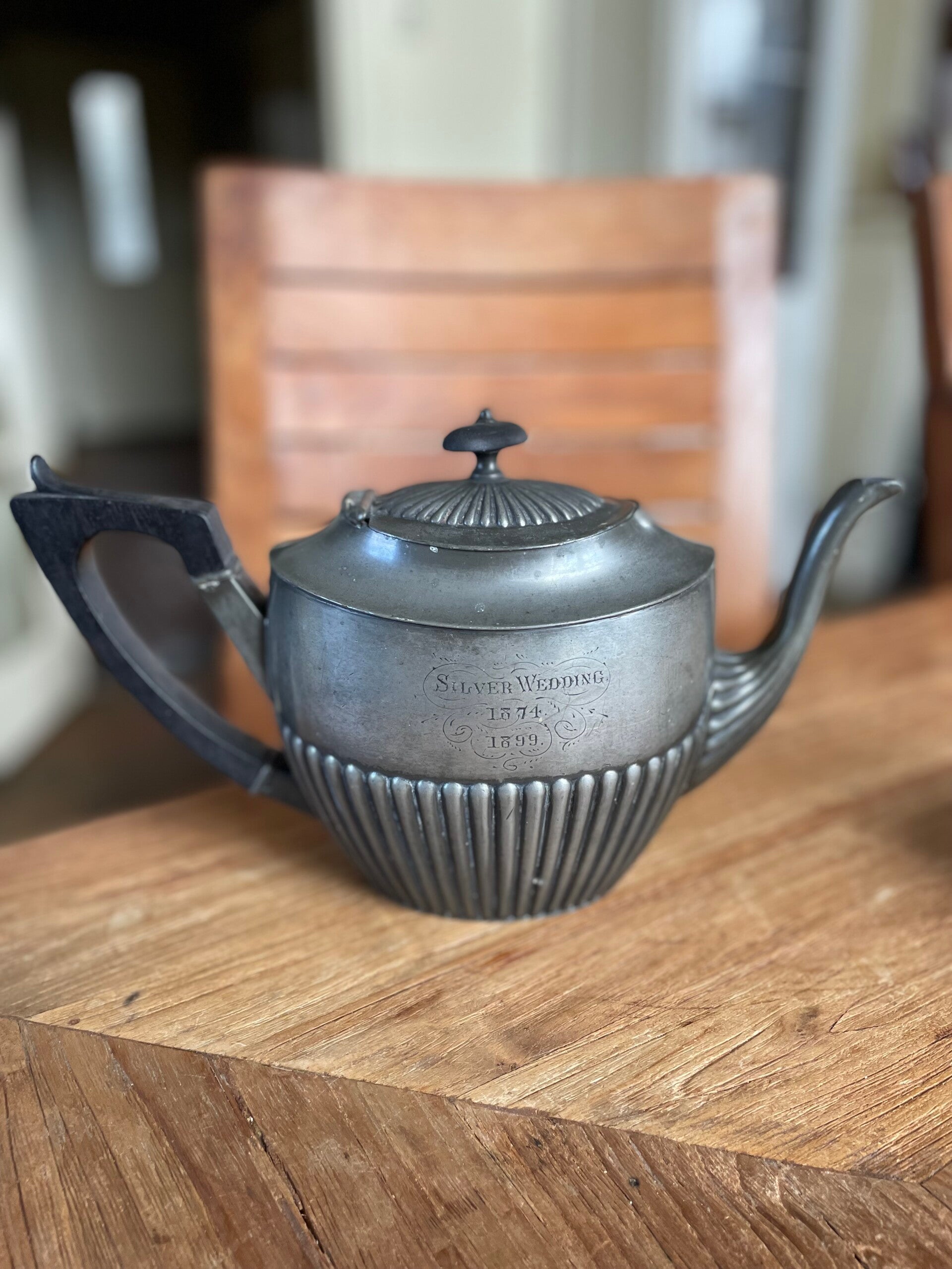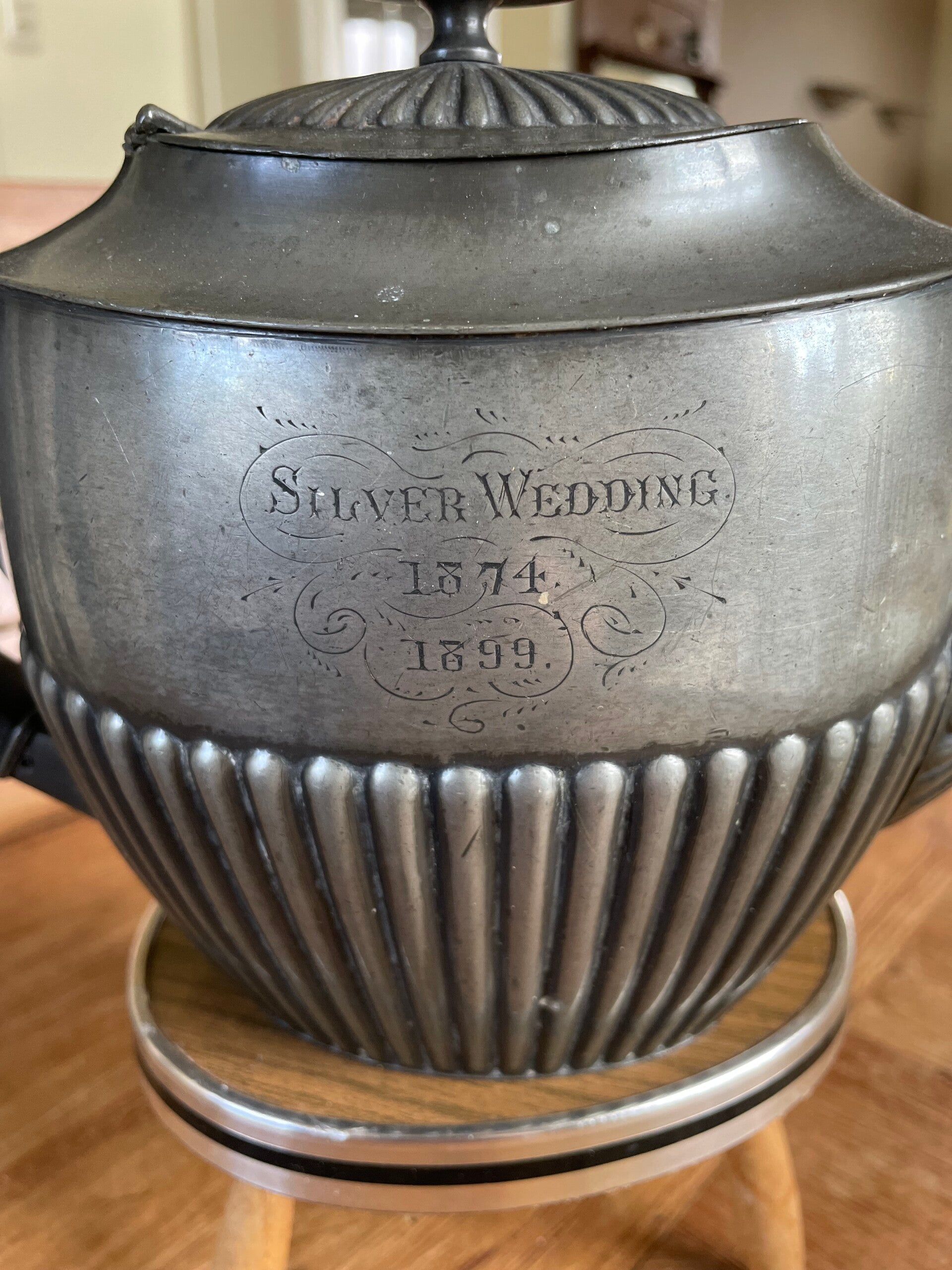 Tinnen theepot met inscriptie 'Silver Wedding'