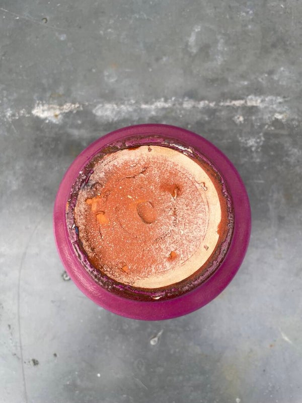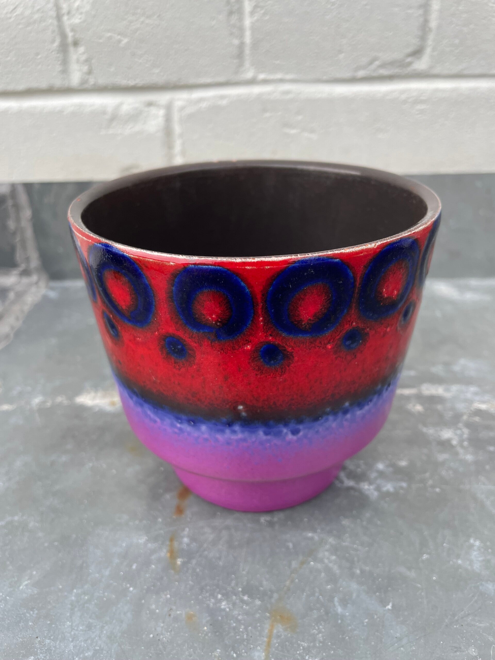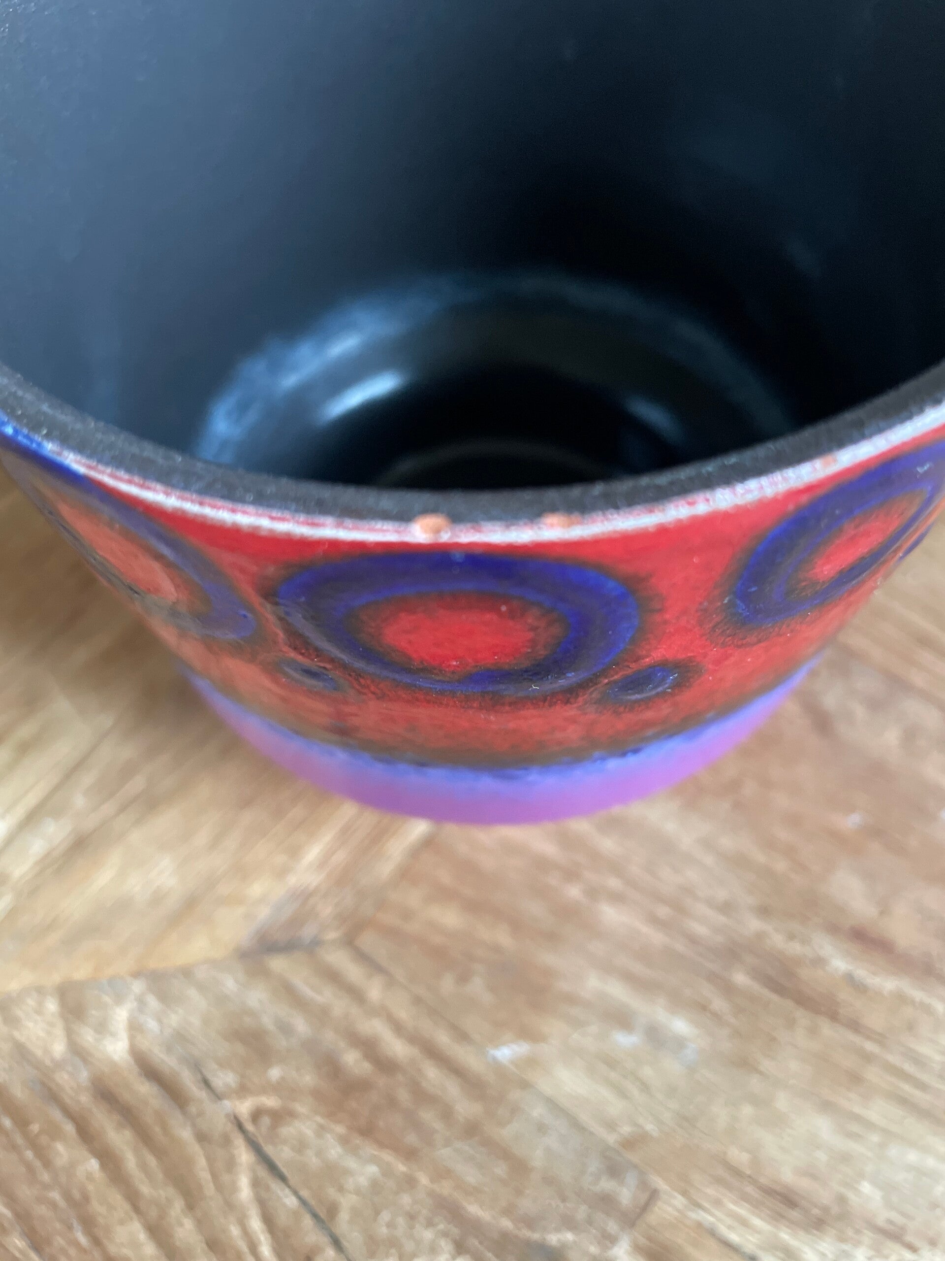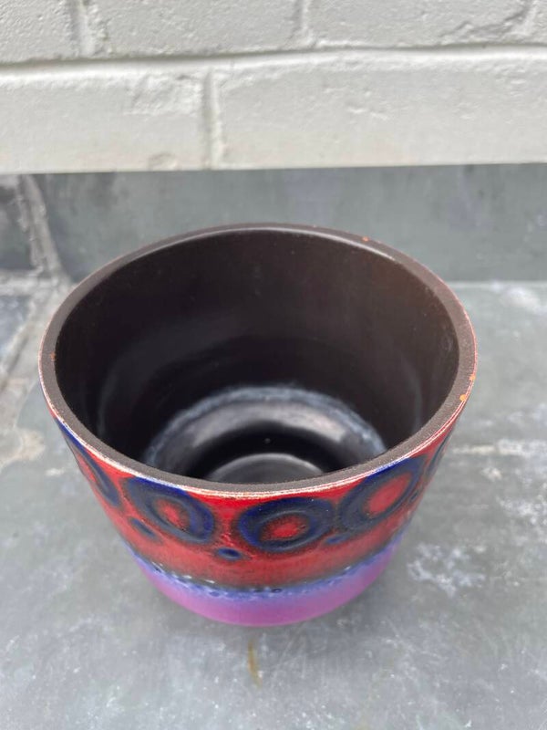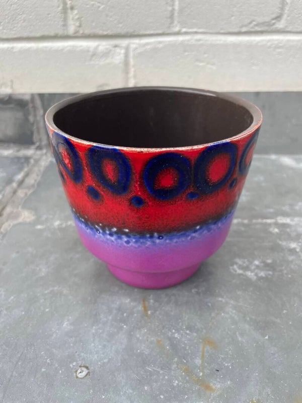 Prachtige Duitse bloempot in mat violet, en glanzend blauw en rood