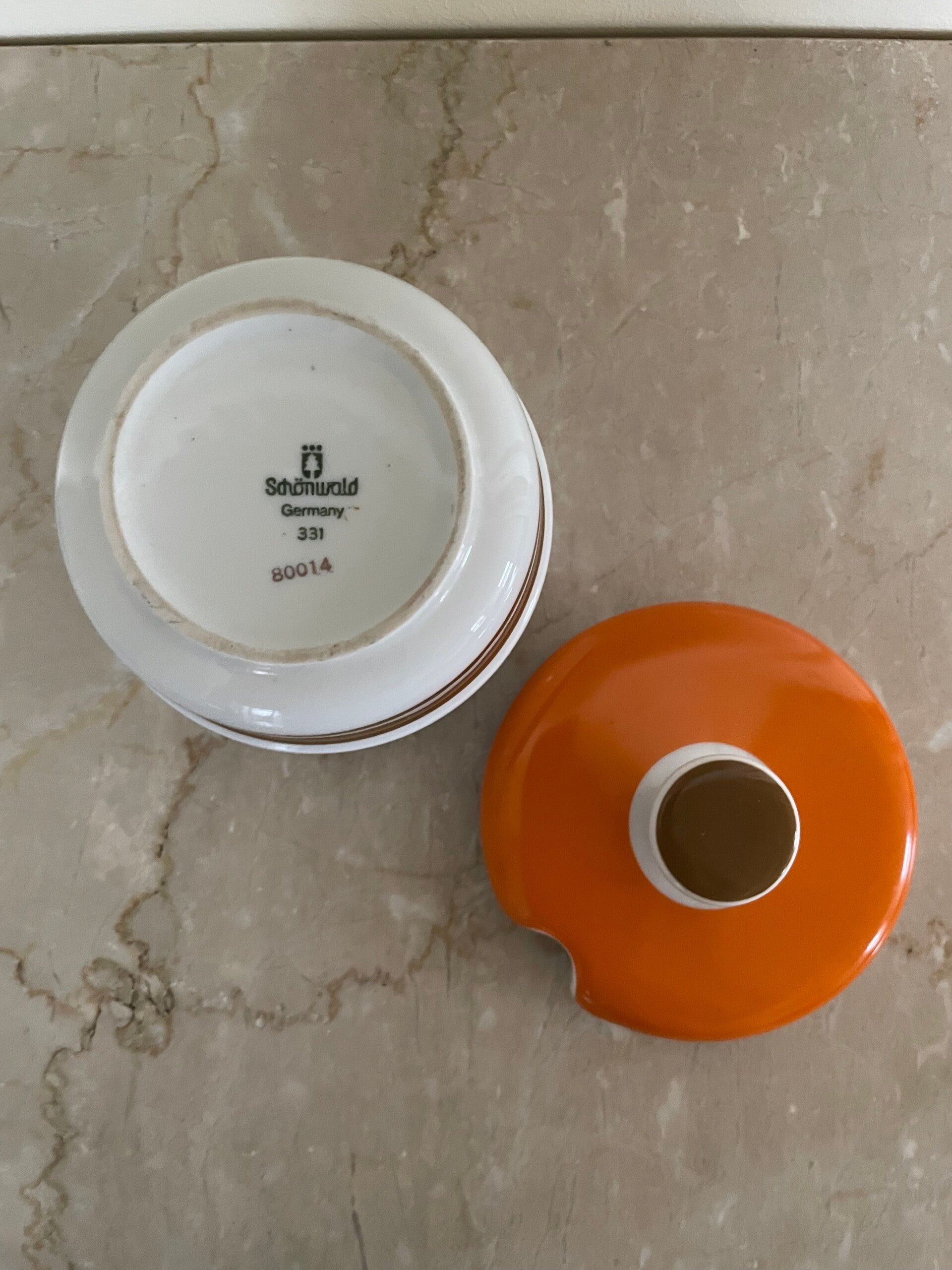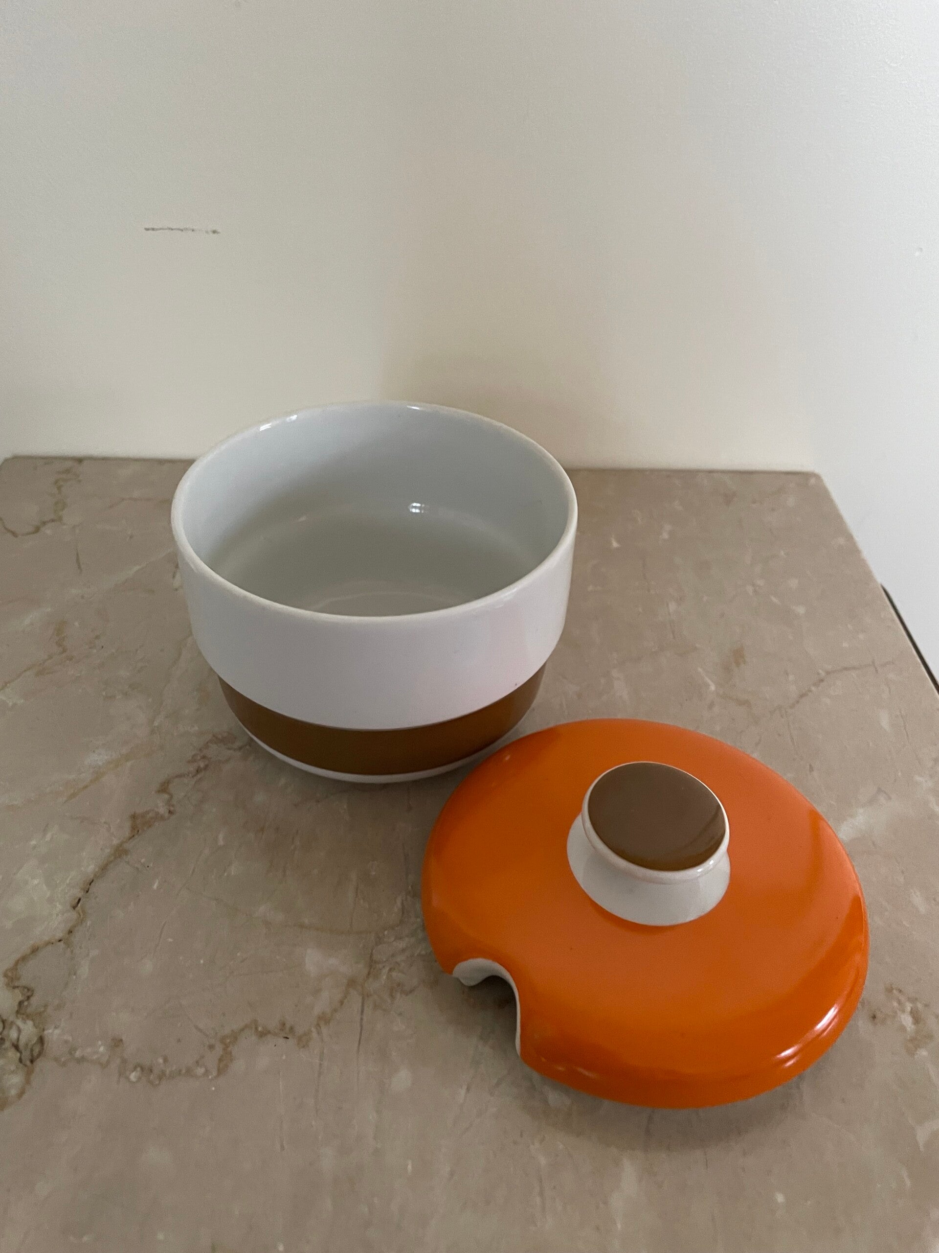 Keramisch potje in oranje, wit en bruin