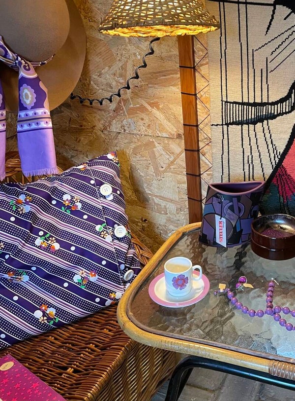 - In paars, wit en violet met groen/geel/oranje bloemetjes