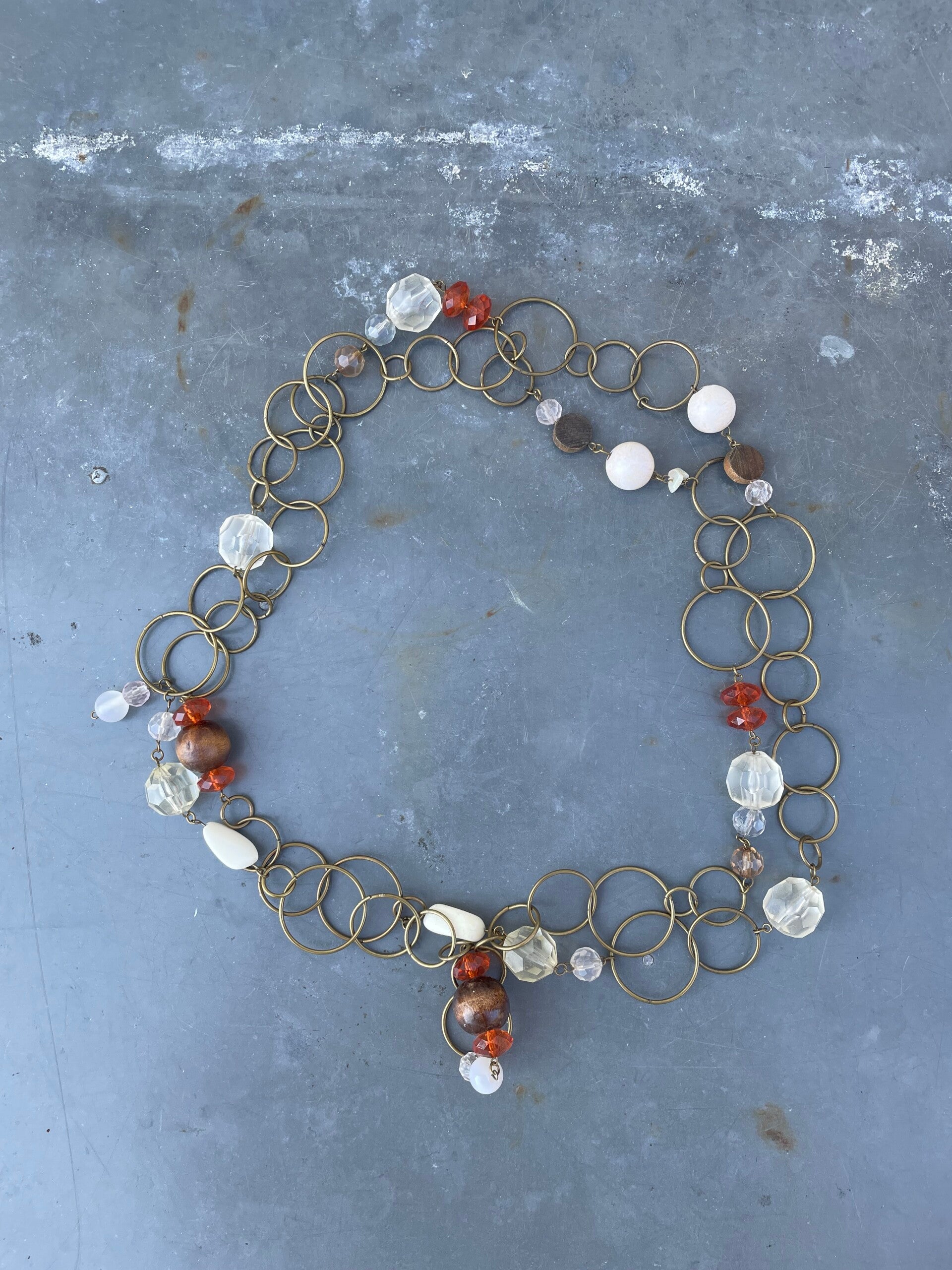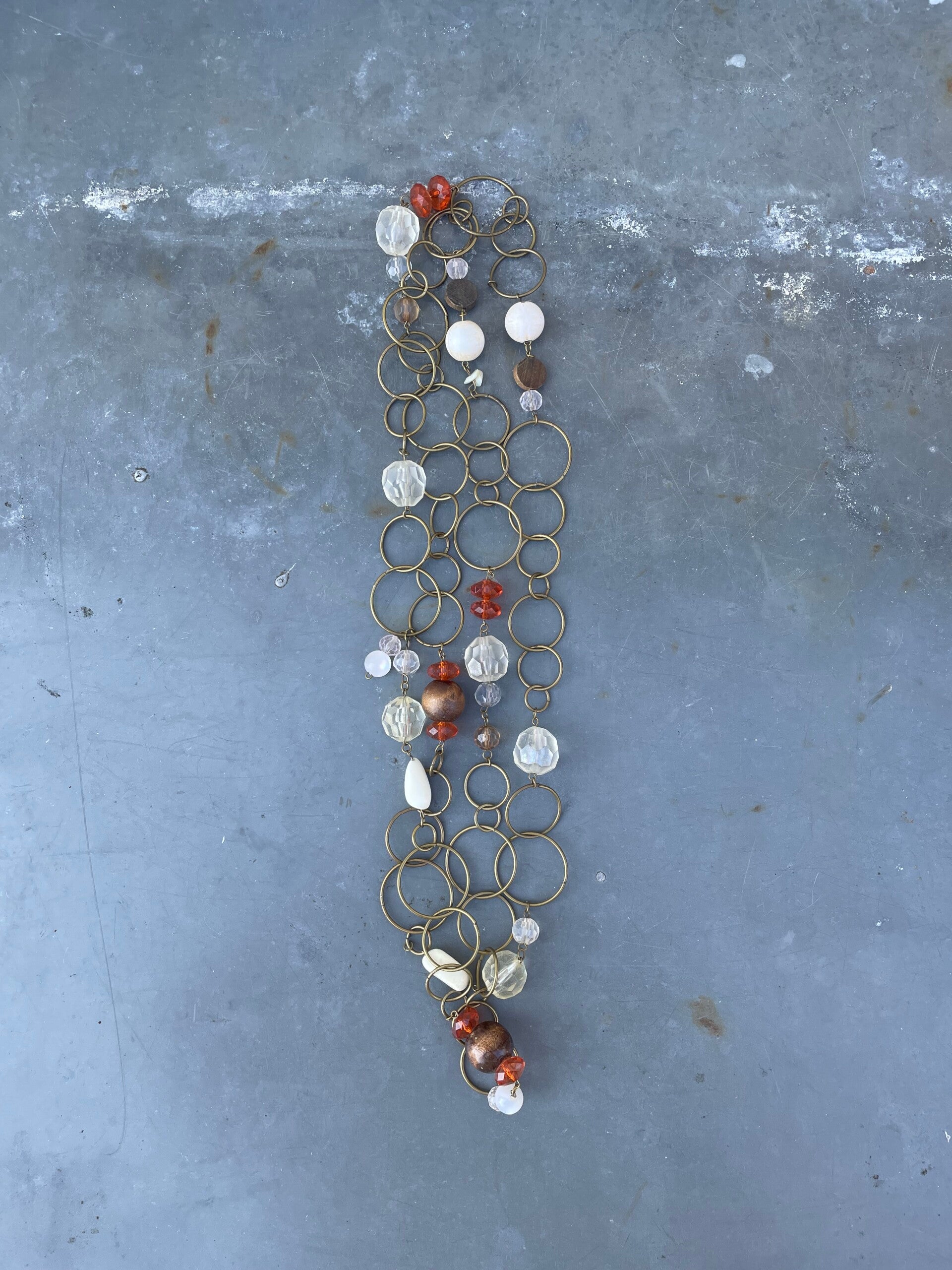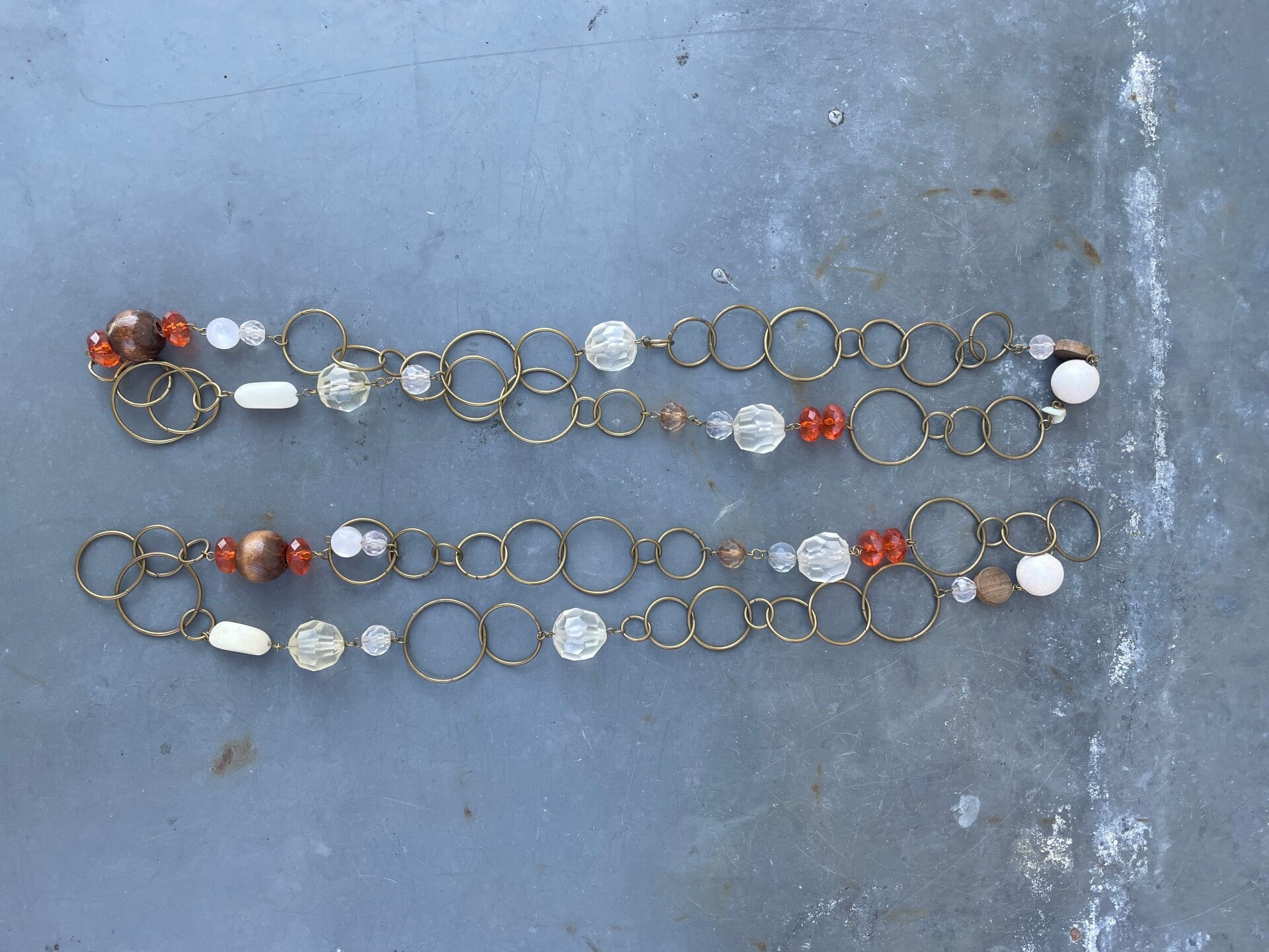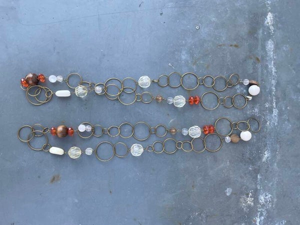 De kettingen bestaan uit diverse formaten cirkels en daartussen kralen in transparant helder en oranje, wit en bruine kralen