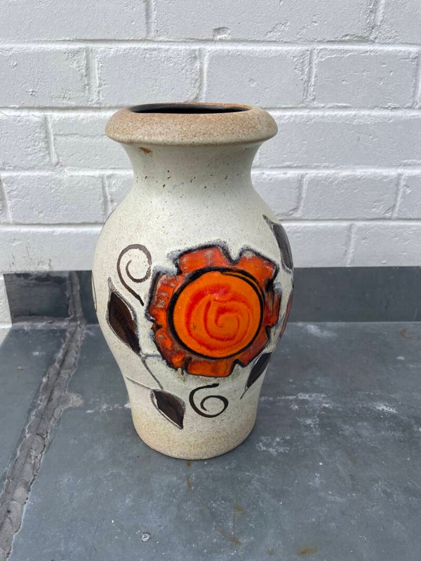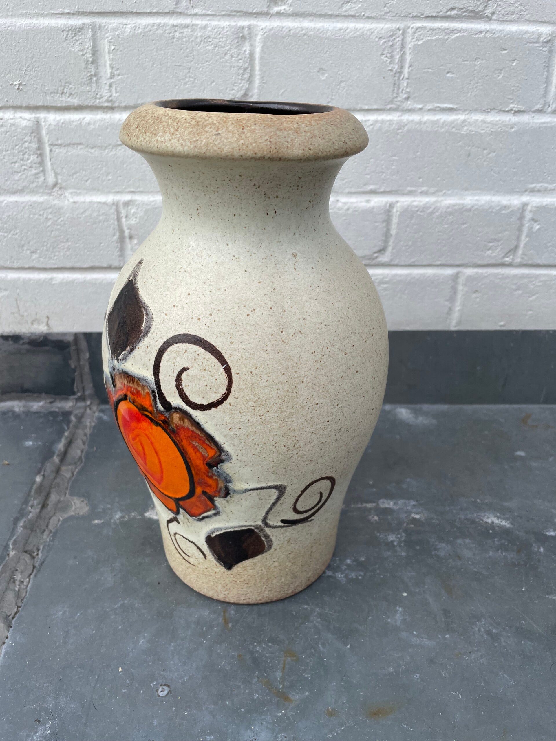 In ivoor/bruin glazuur met oranje bloemen en bruin zwarte bladeren en krullen