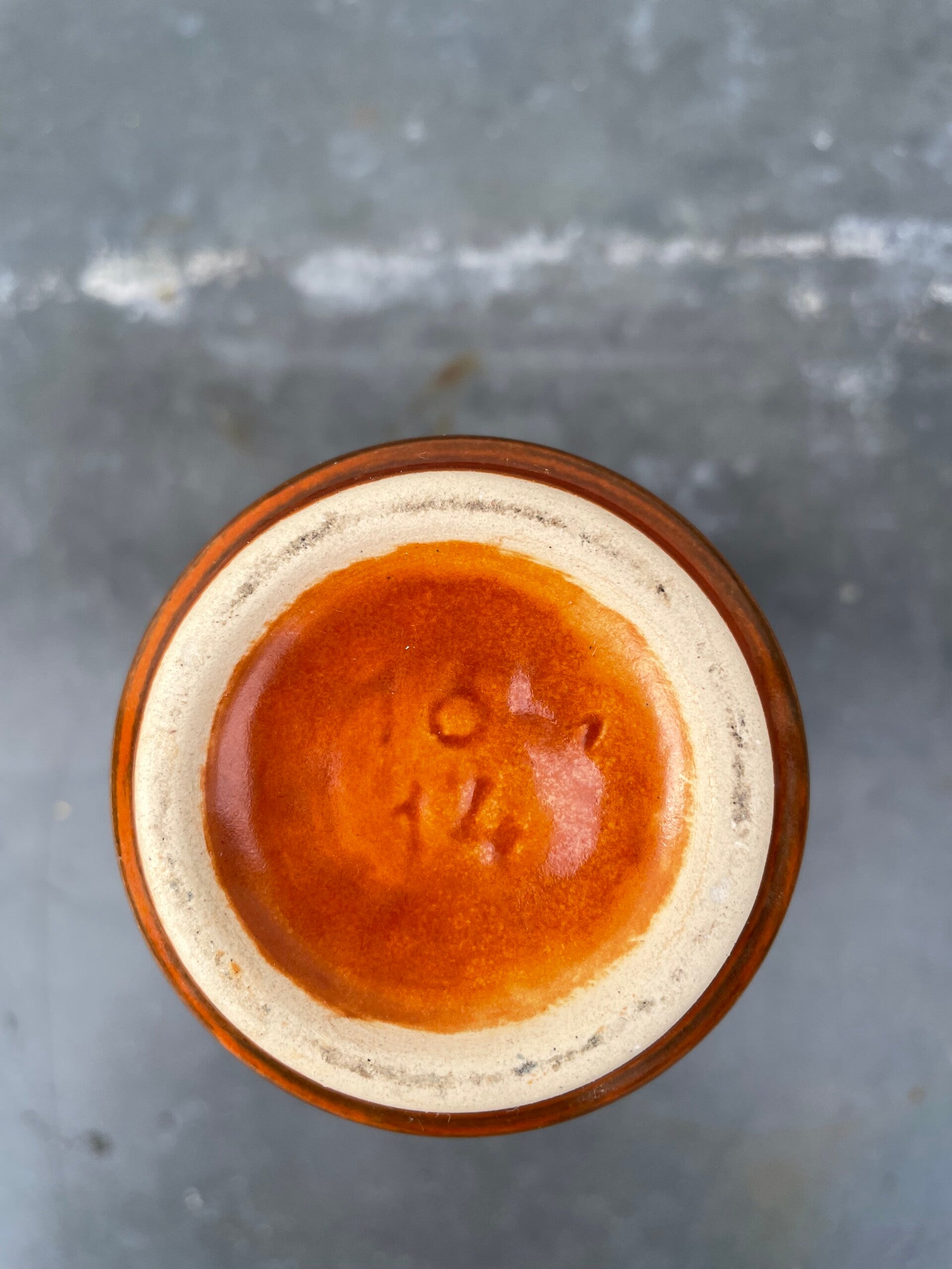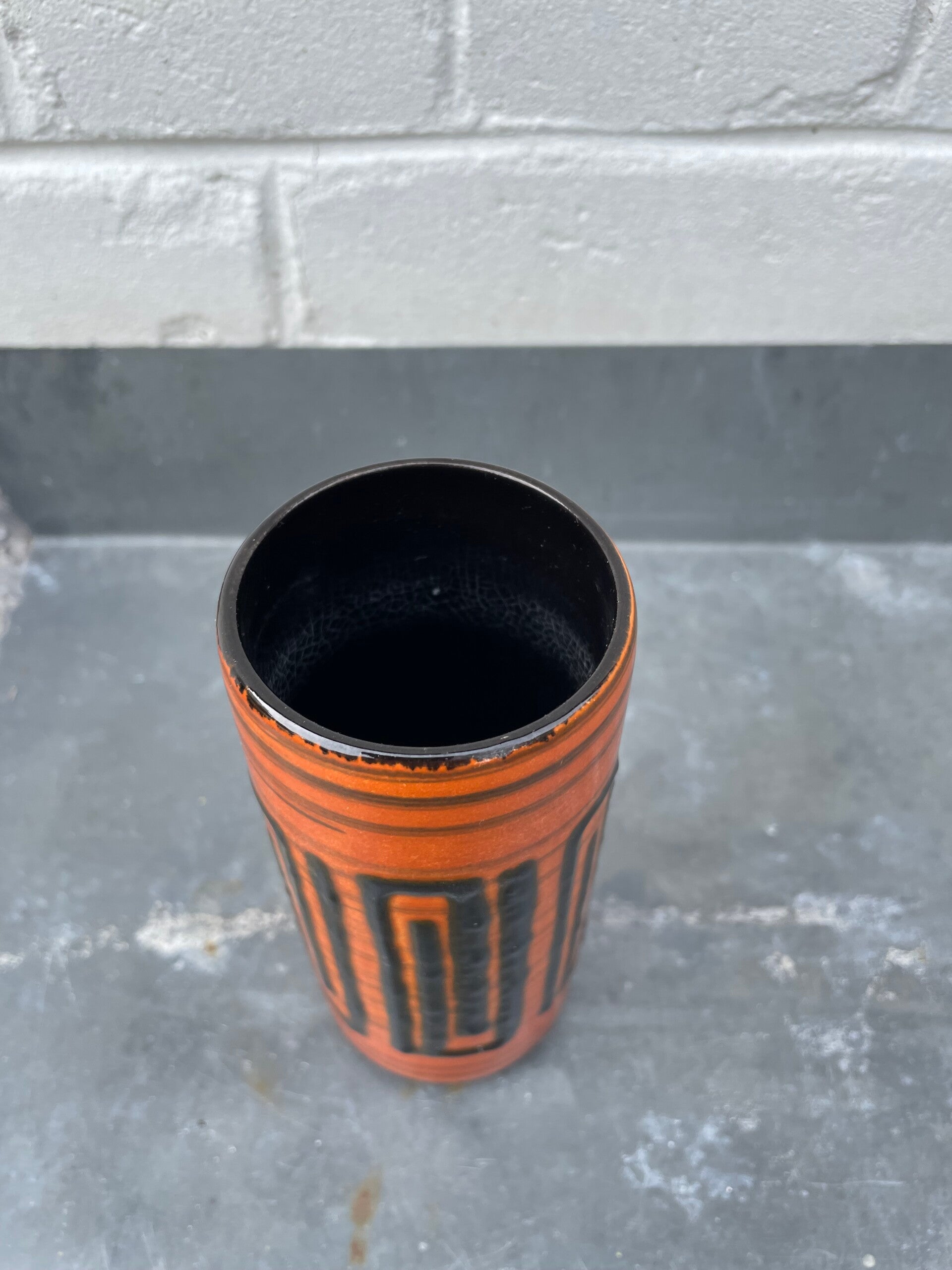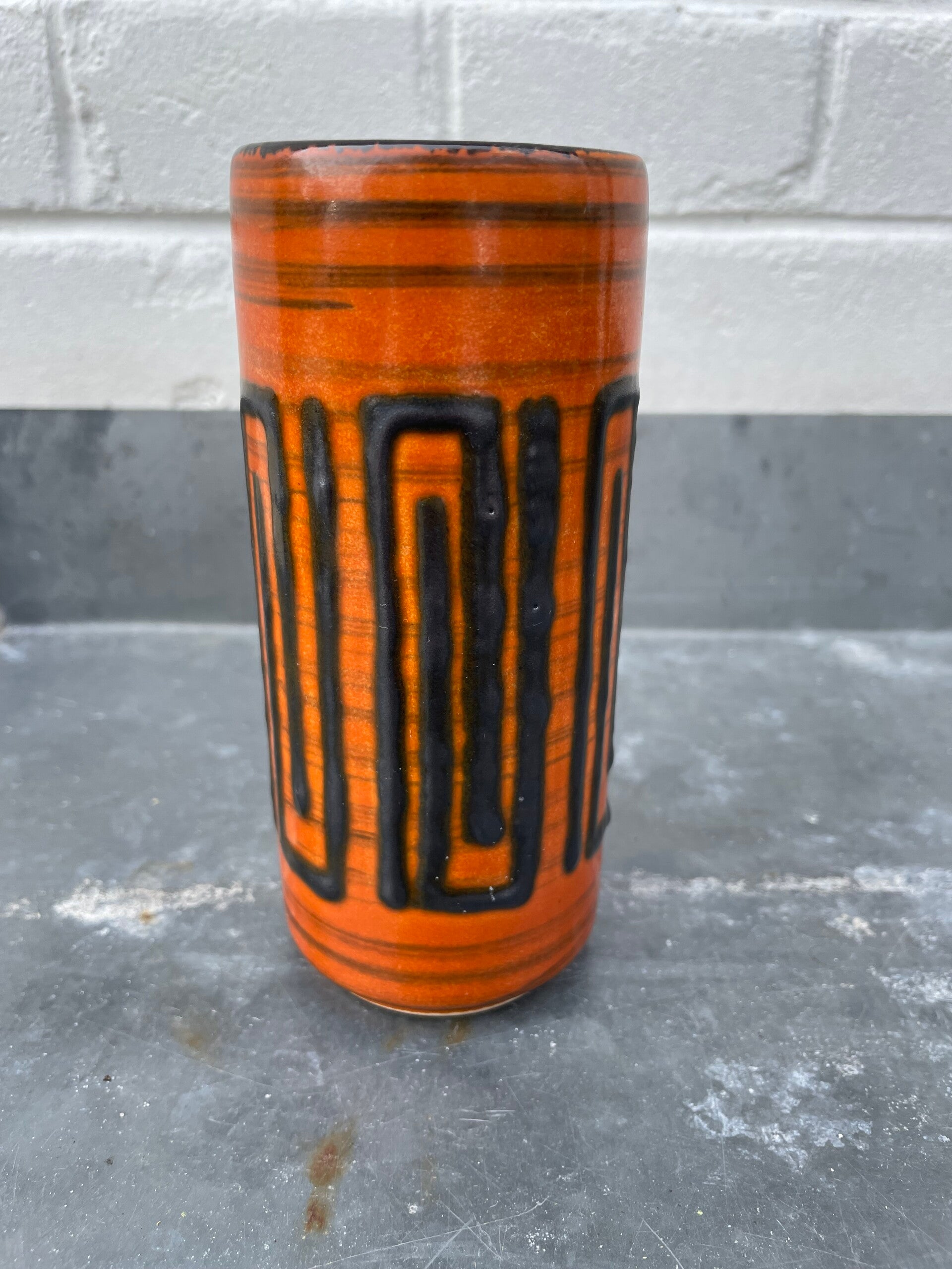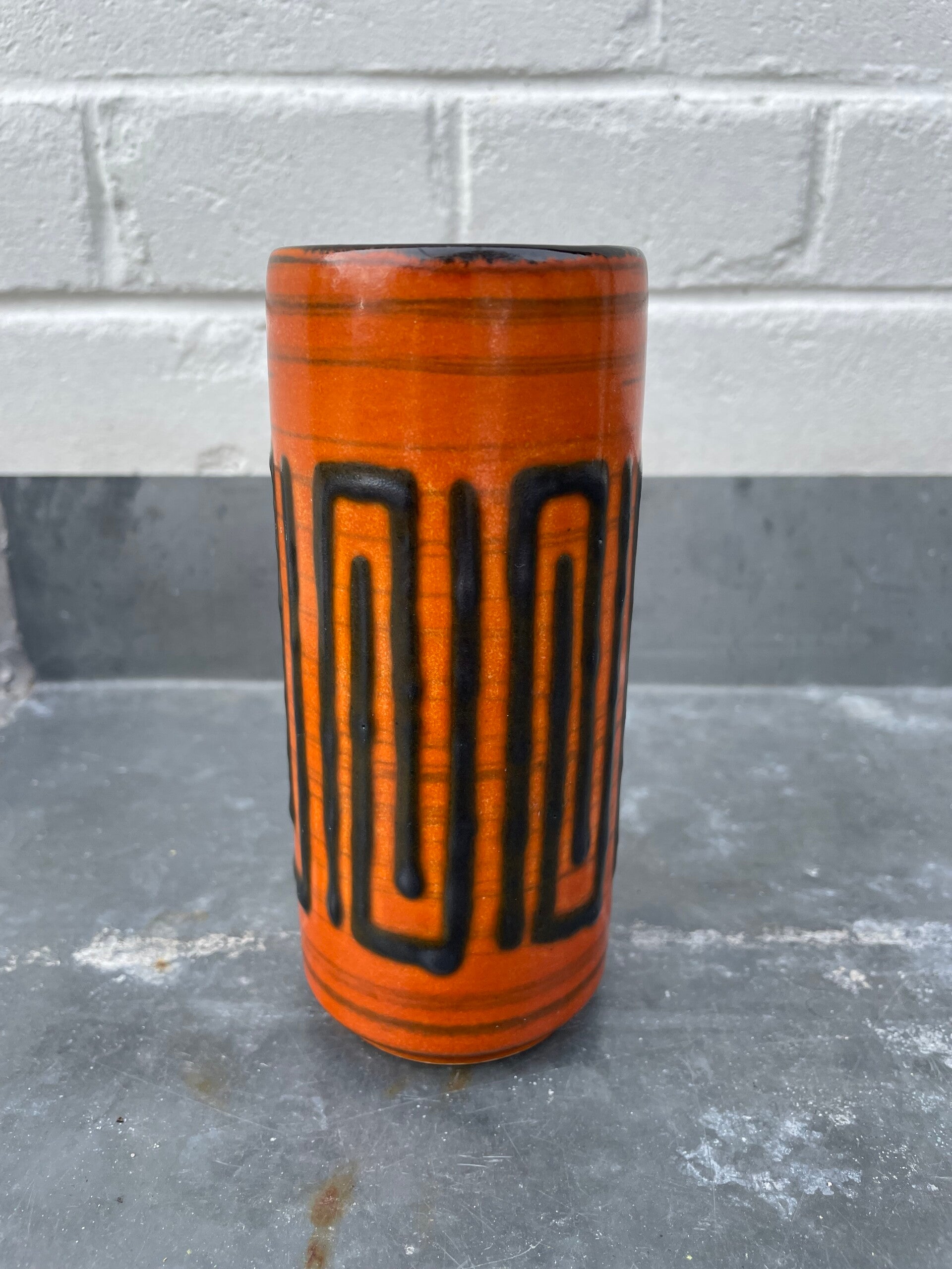 In oranje met horizontale strepen en geometrische lijnen opgelegd