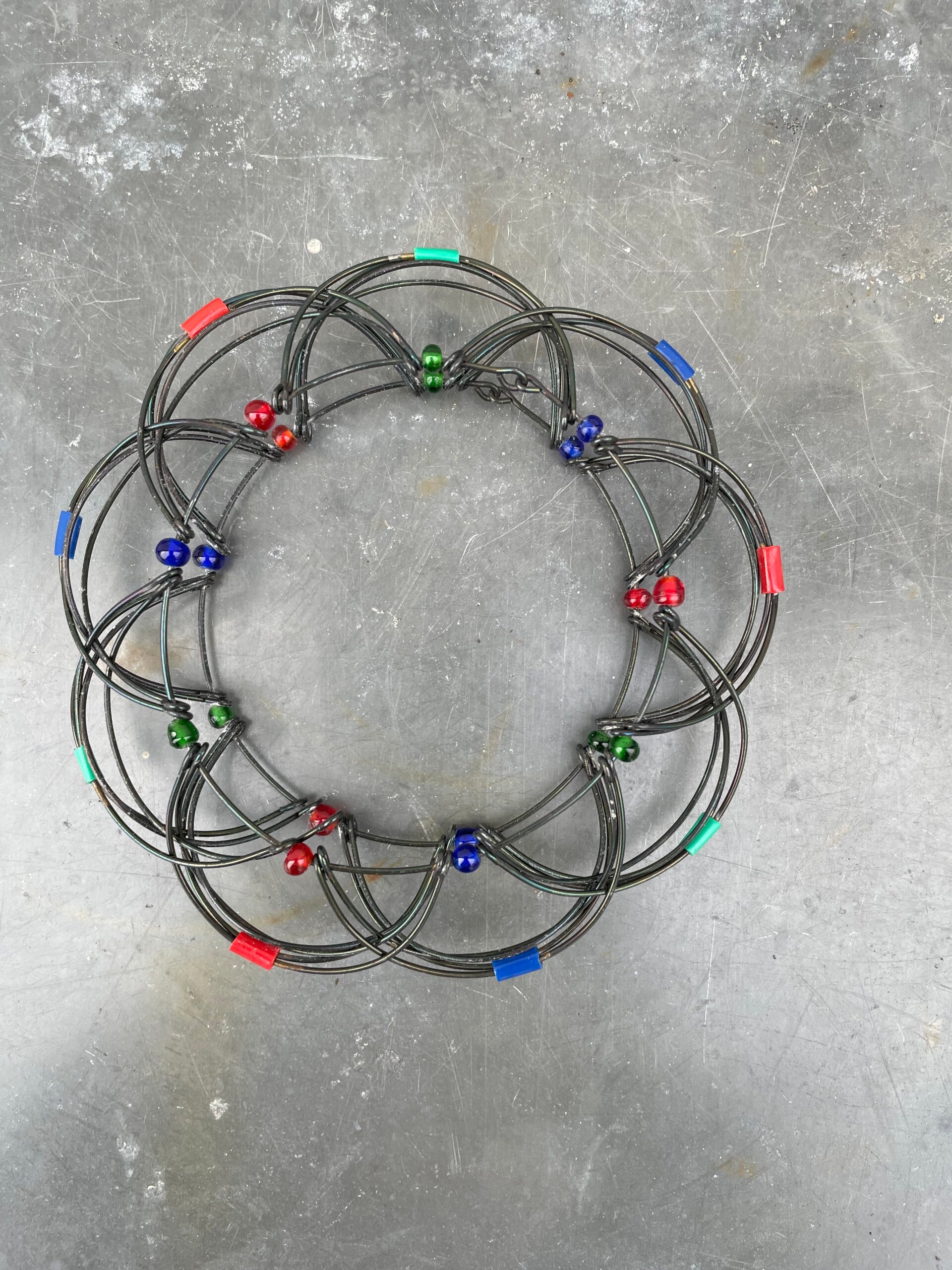 Bestaande uit zwart metaaldraad en groen, rode en blauwe kraaltjes
