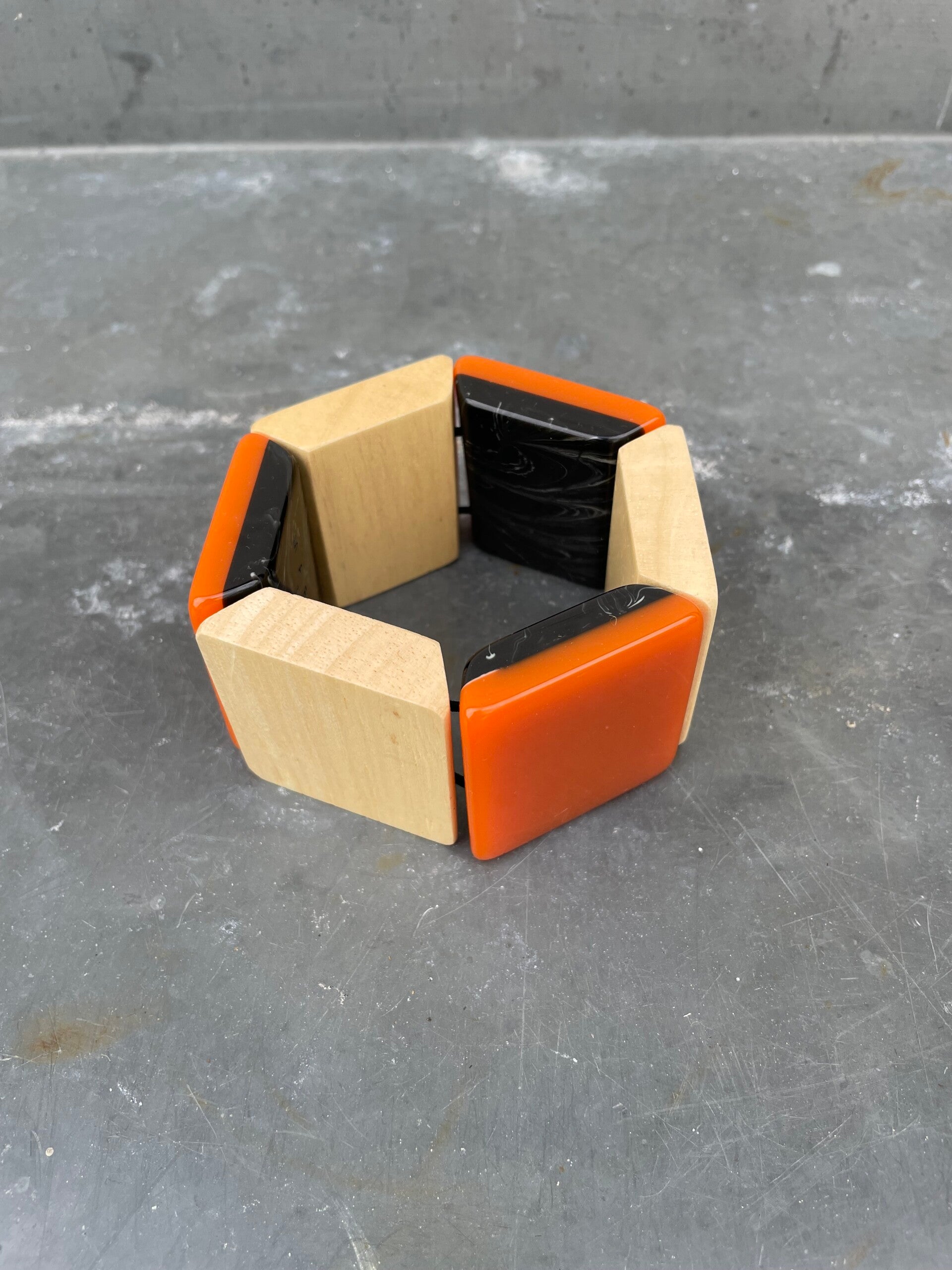 - Chuncky stretch armband bestaande uit blokken in oranje/zwart kunststof gecombineerd met licht houten blokken, geregen op twee rijen elastiek