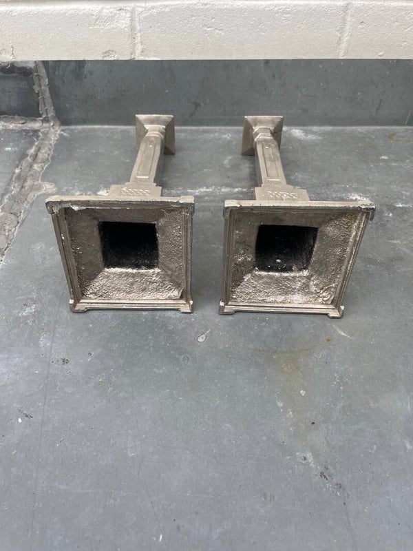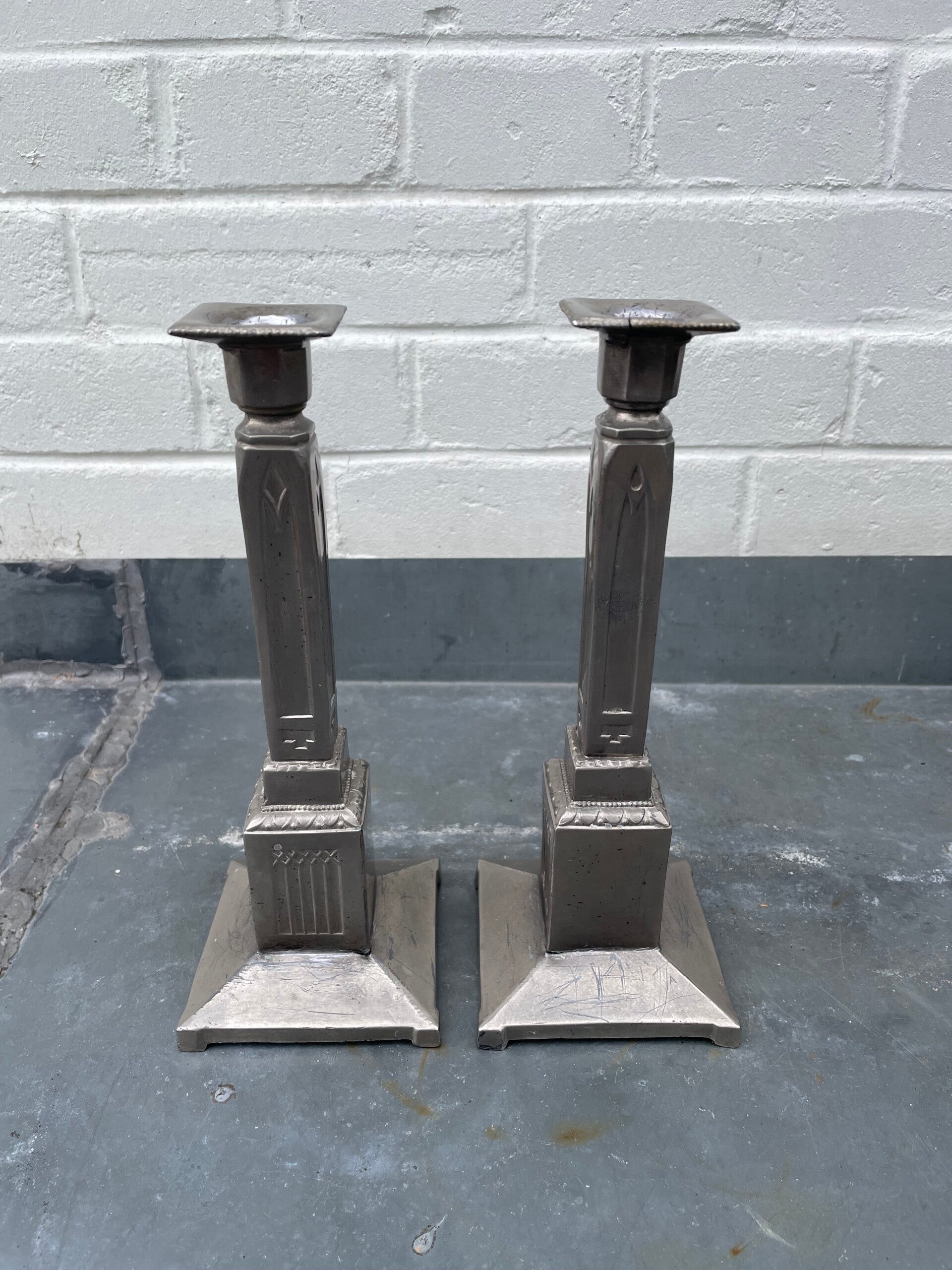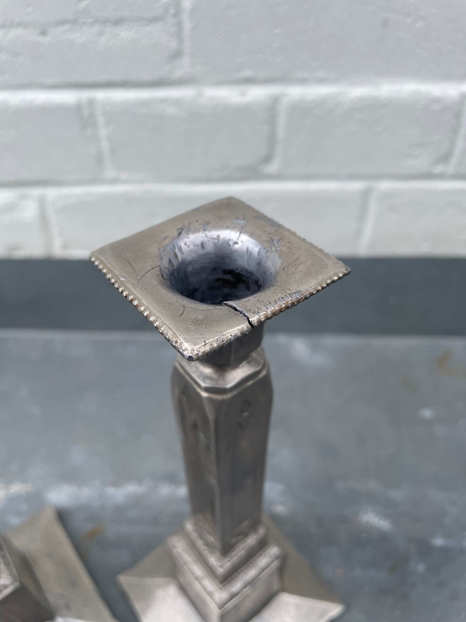 - De kandelaars vertonen gebruikerssporen waaronder krasjes en een breuk in één van de twee aan de bovenzijde (zie foto's) Vermoedelijk is een kaars te ver doorgebrand en daardoor de kandelaar geknapt