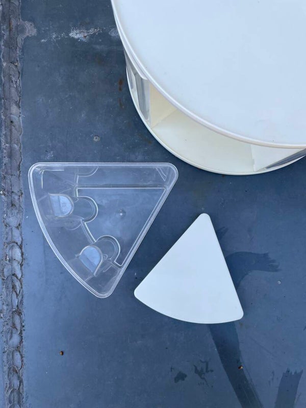 - De carrousel heeft gebruikssporen als een paar breukjes in de bakken en één deksel mist een puntje (zie foto's)